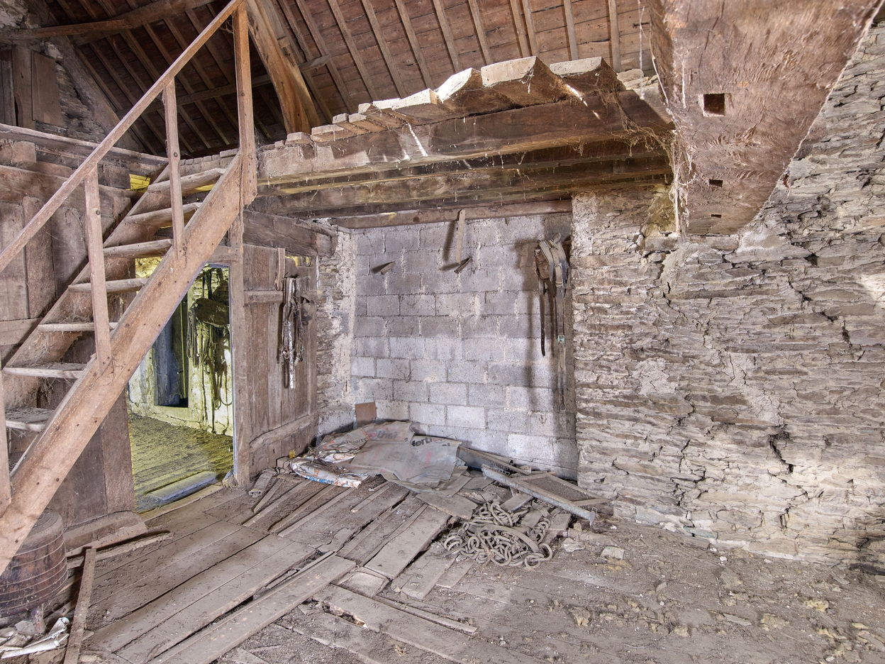 Logis. Etage. Emplacement de l'escalier en vis en demi hors-oeuvre ; à droite poutre avec les mortaises d'une cloison disparue ; à gauche cloison en bois tardiveImmatriculation
