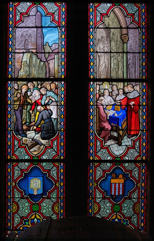 Cycle de verrières, baies 9 à 23 : histoire de Notre-Dame de Délivrance et de la relique de la ceinture de la Vierge ; épisodes de la vie de la Vierge et de l'Enfance du Christ ; cultes et thèmes mariaux, basilique Notre-Dame-de-Délivrance (Quintin),