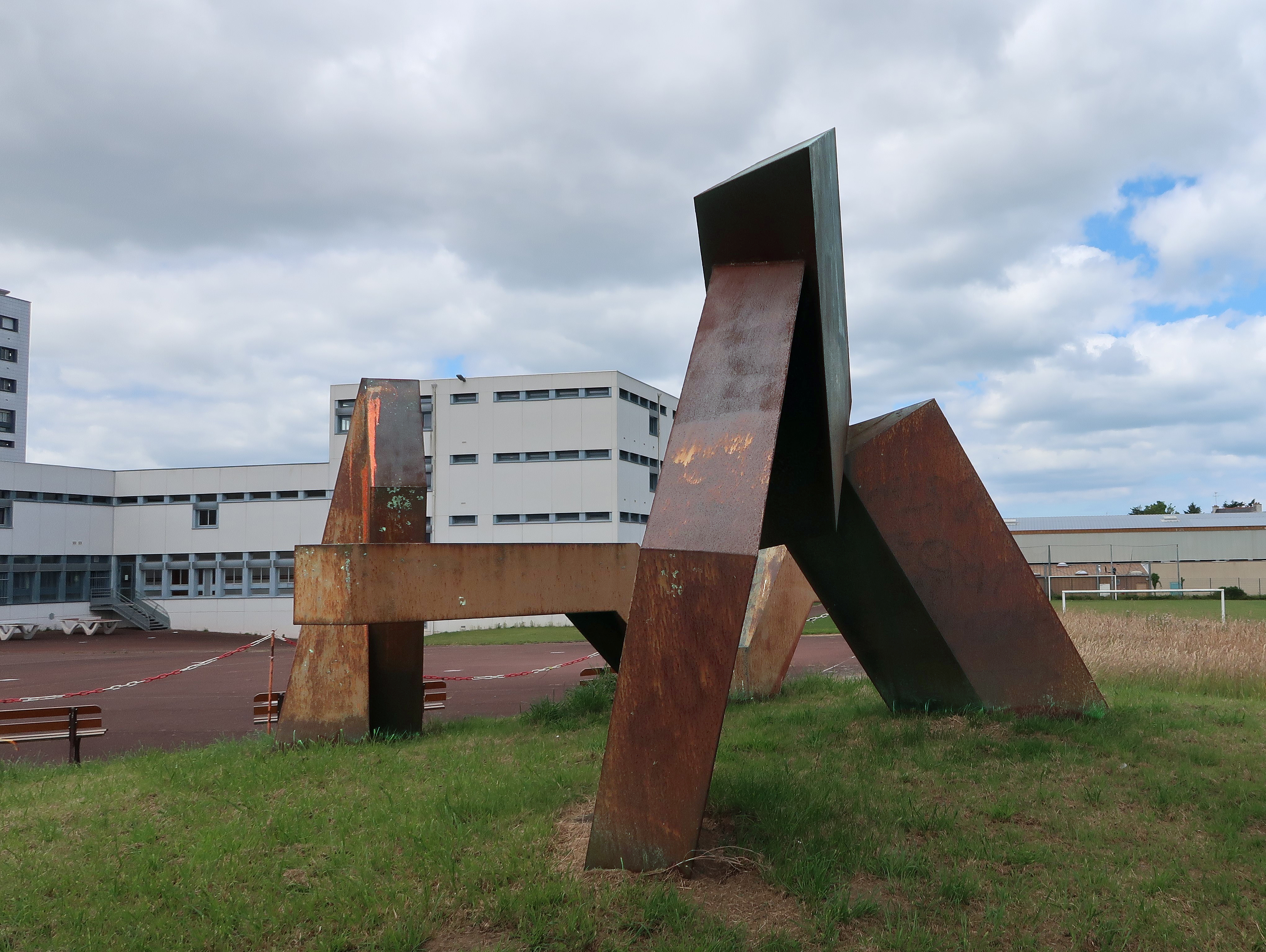 Vue partielle sur trois éléments de la sculpture de Pierre Tual, vers 1975-1976.Immatriculation