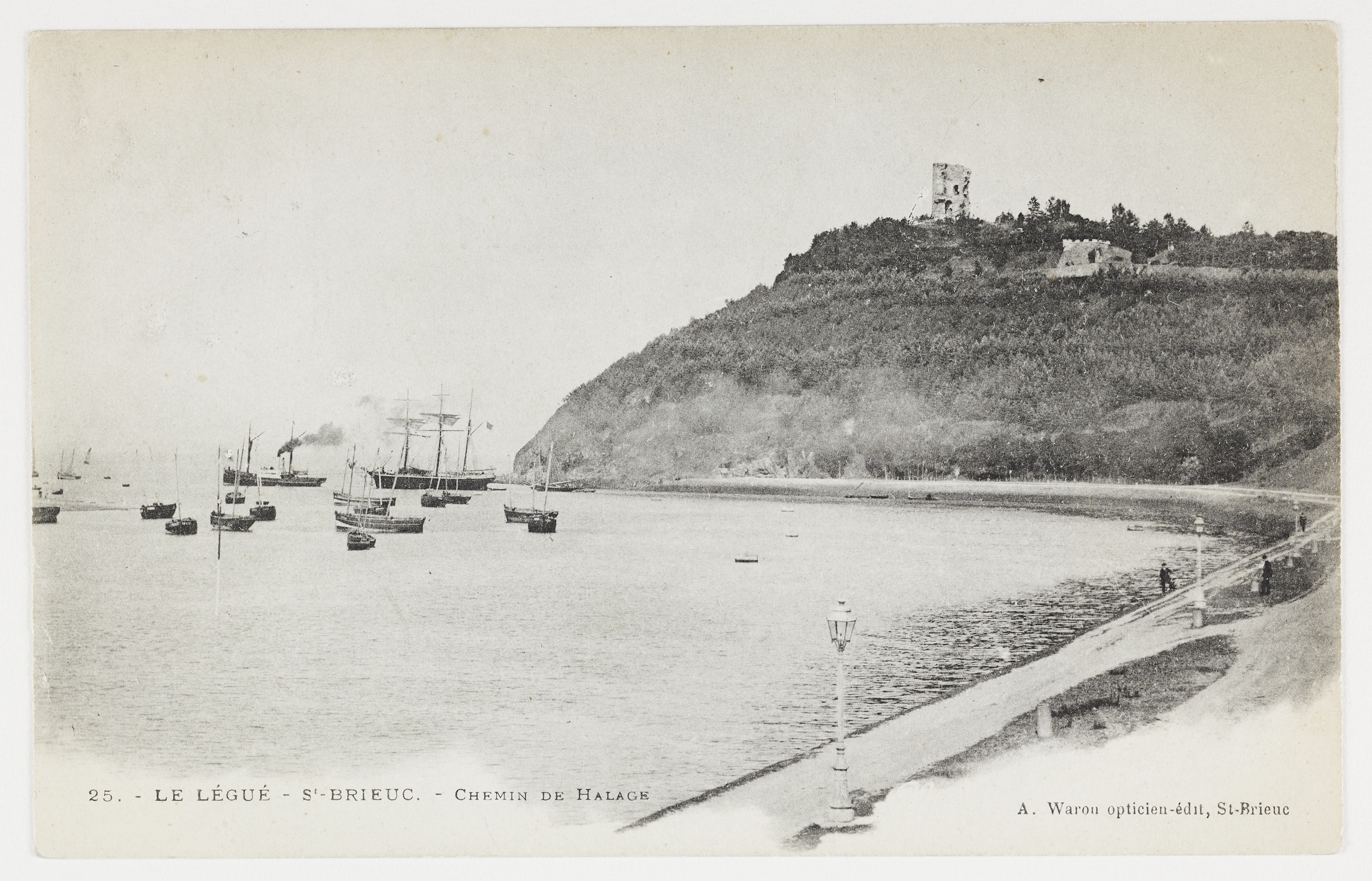 Vue de la Pointe de Cesson depuis le chemin de halage du port du Légué, carte postale (éditions A. Waron, Saint-Brieuc). On distingue notamment le crénelage du belvédère de jardin dit Tour Malakoff et le mur de clôture du domaine ; la tour couronne la pointeImmatriculation