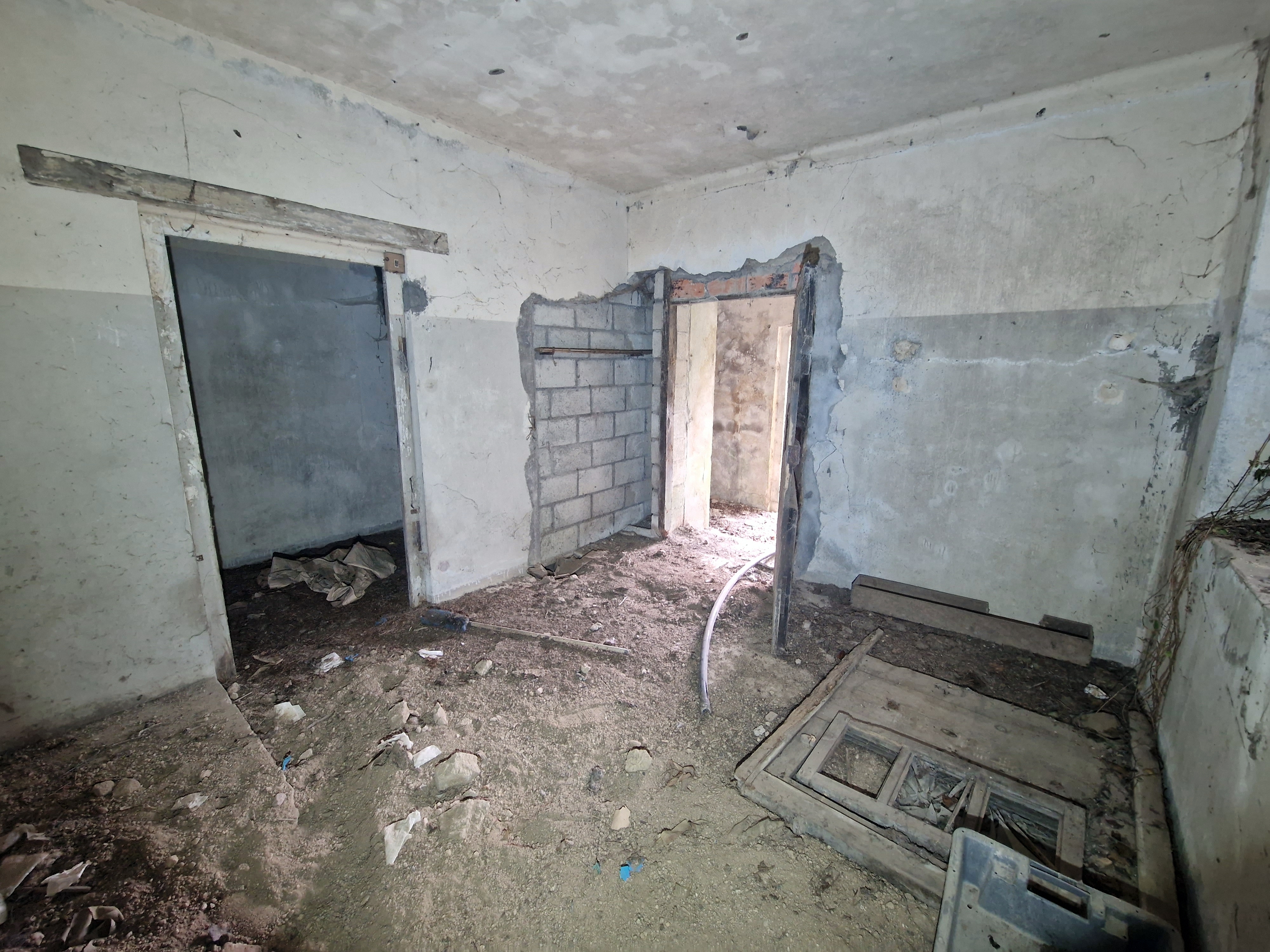 Vue générale de la pièce ouest. A gauche, porte donnant sur le couloir est. Au sol à droite, la porte en bois avec jourImmatriculation
