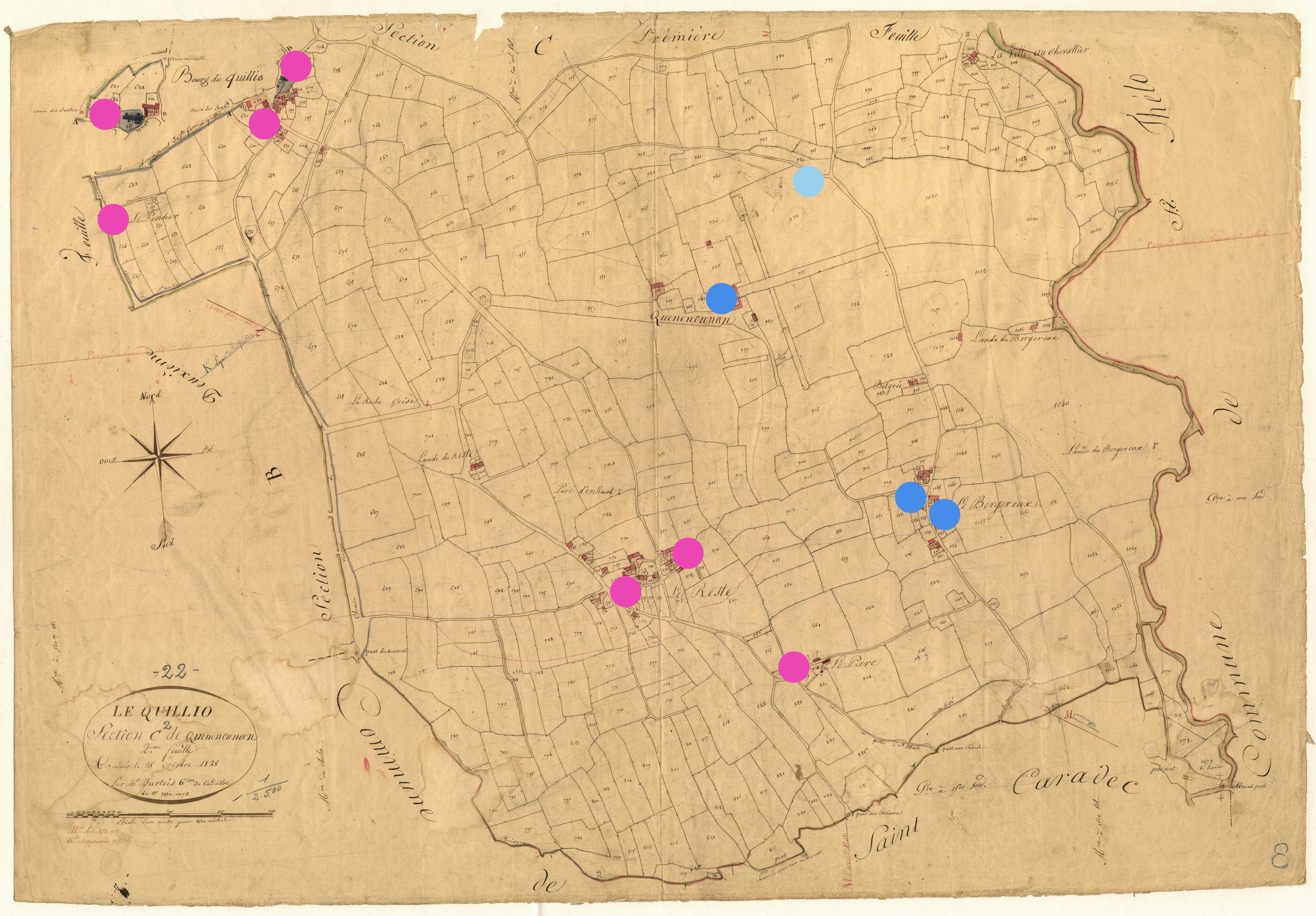 Patrimoine lié à l’histoire toilière du Quillio - Localisation des fermes ou maisons de marchand de toiles (points roses), des doués (points bleus clairs), et des maisons, fermes de blanchisseurs ou blanchisseries (points bleus foncés). Etendoirs entourés en bleu. D'après les états de section de 1829, section C2 (série 3 P 265, Archives départementales des Côtes-d'Armor)Immatriculation
