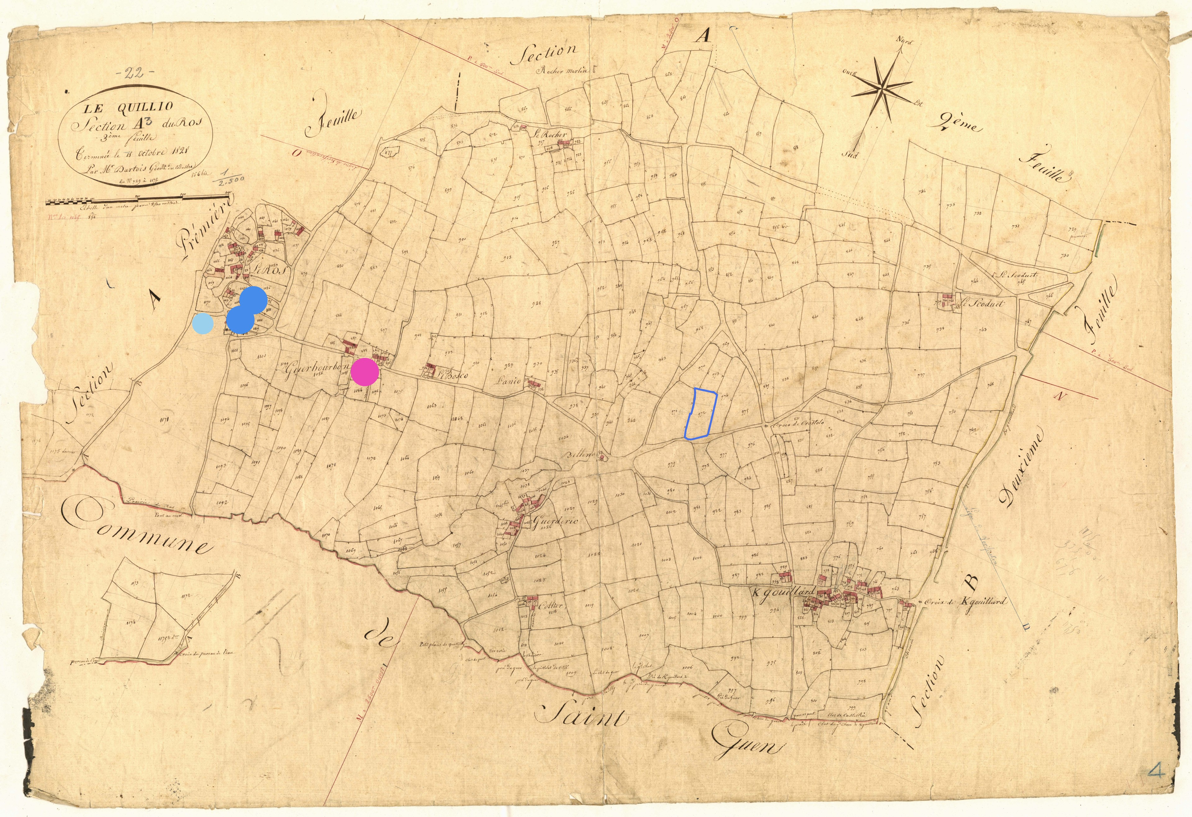 Patrimoine lié à l’histoire toilière du Quillio - Localisation des fermes ou maisons de marchand de toiles (points roses), des doués (points bleus clairs), et des maisons, fermes de blanchisseurs ou blanchisseries (points bleus foncés). Etendoirs entourés en bleu. D'après les états de section de 1829, section A3 (série 3 P 265, Archives départementales des Côtes-d'Armor)Immatriculation
