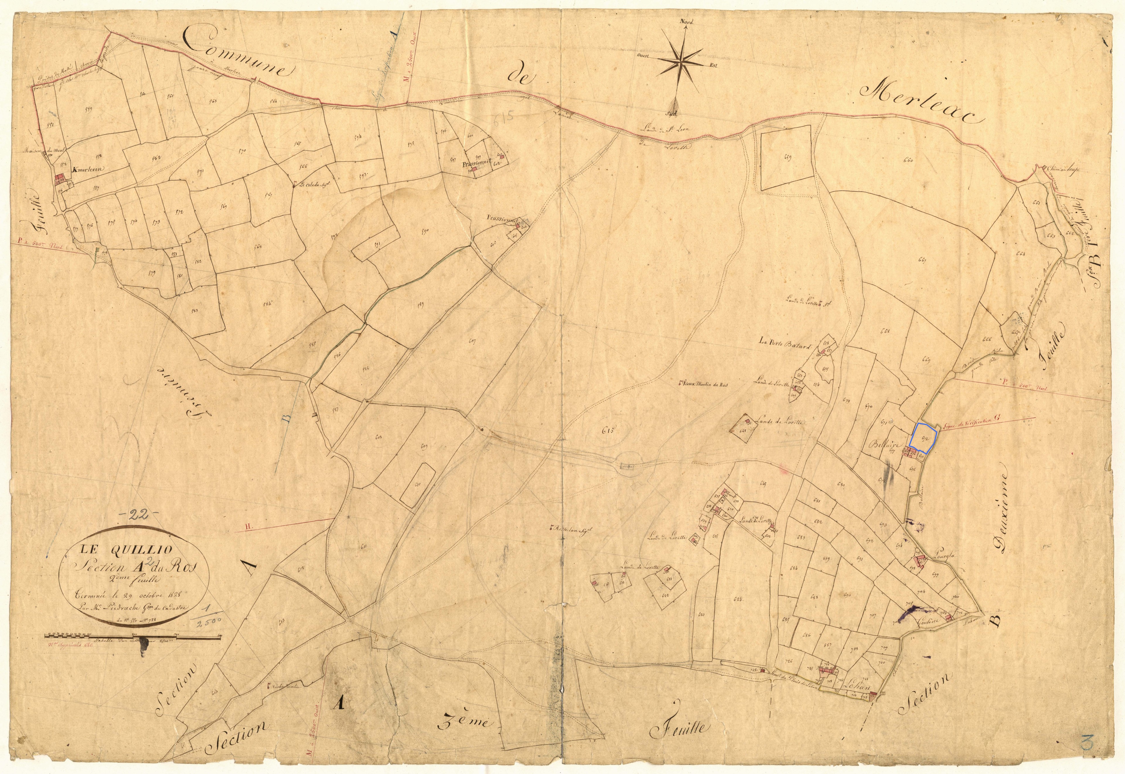Patrimoine lié à l’histoire toilière du Quillio - Localisation des fermes ou maisons de marchands (points roses), des doués (points bleus clairs), et des maisons, fermes de blanchisseurs ou blanchisseries (points bleus foncés). Etendoirs entourés en bleu. D'après les états de section de 1829, section A2 (série 3 P 265, Archives départementales des Côtes-d'Armor)Immatriculation