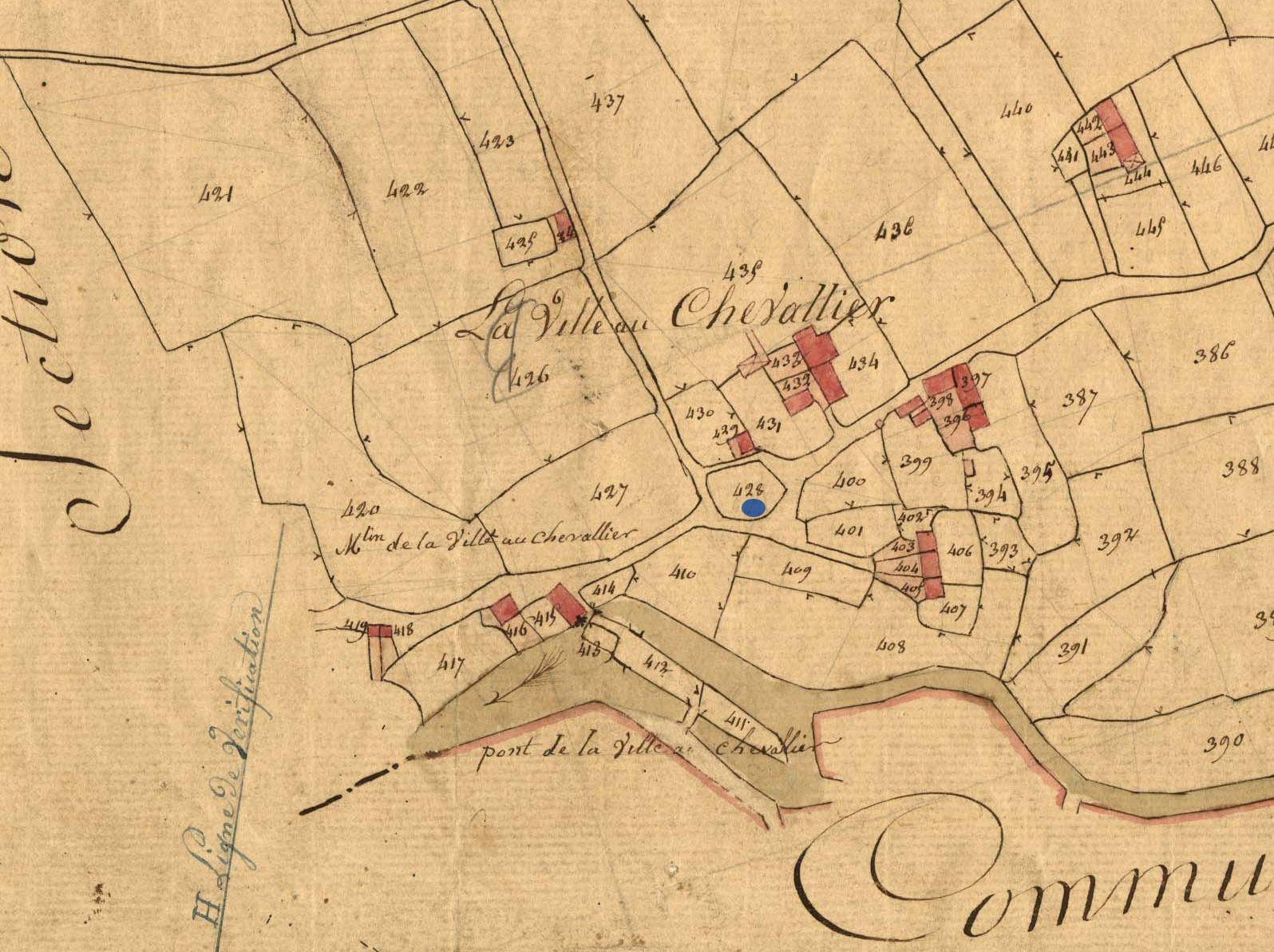 Localisation du lavoir sur le cadastre ancien de 1828. Extrait de la section C1 (Archives départemantales des Côtes-d'Armor, série 3P, sous série 3P 265)Immatriculation
