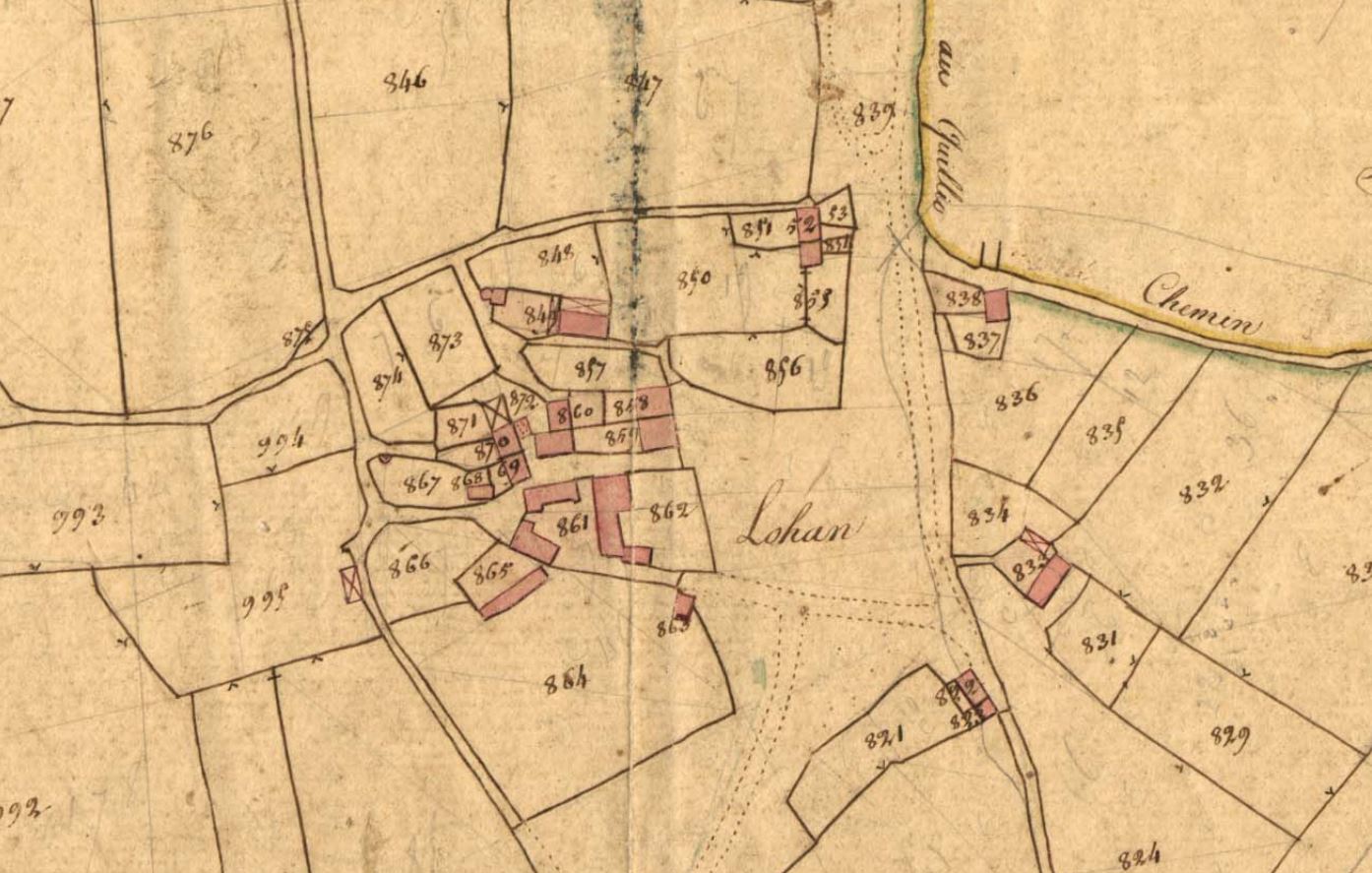 Lohan en 1828. Extrait du cadastre ancien, section B2 (Archives départementales des Côtes-d'Armor, série 3 P 265)Immatriculation