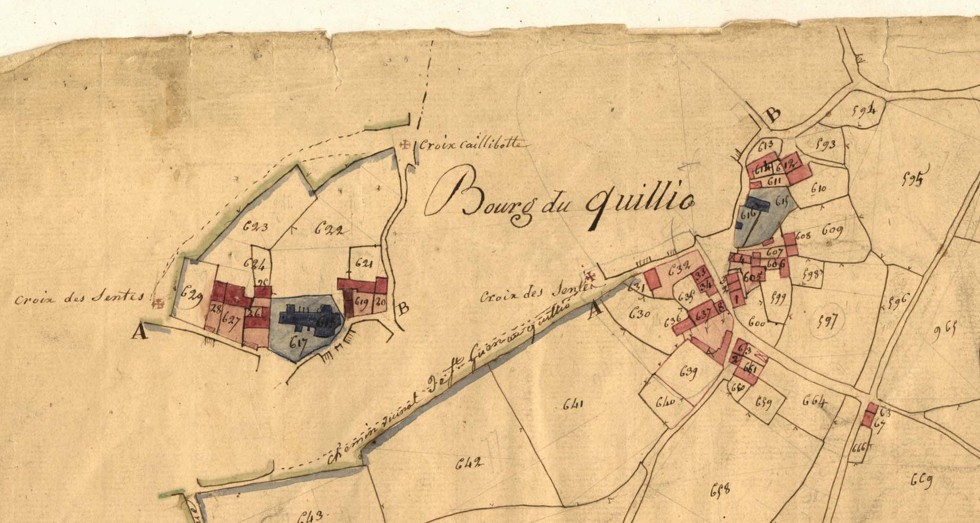 Le bourg du Quillio en 1828. Extrait du cadastre ancien, section C2 (Archives départementales des Côtes-d'Armor, série 3 P 265)Immatriculation