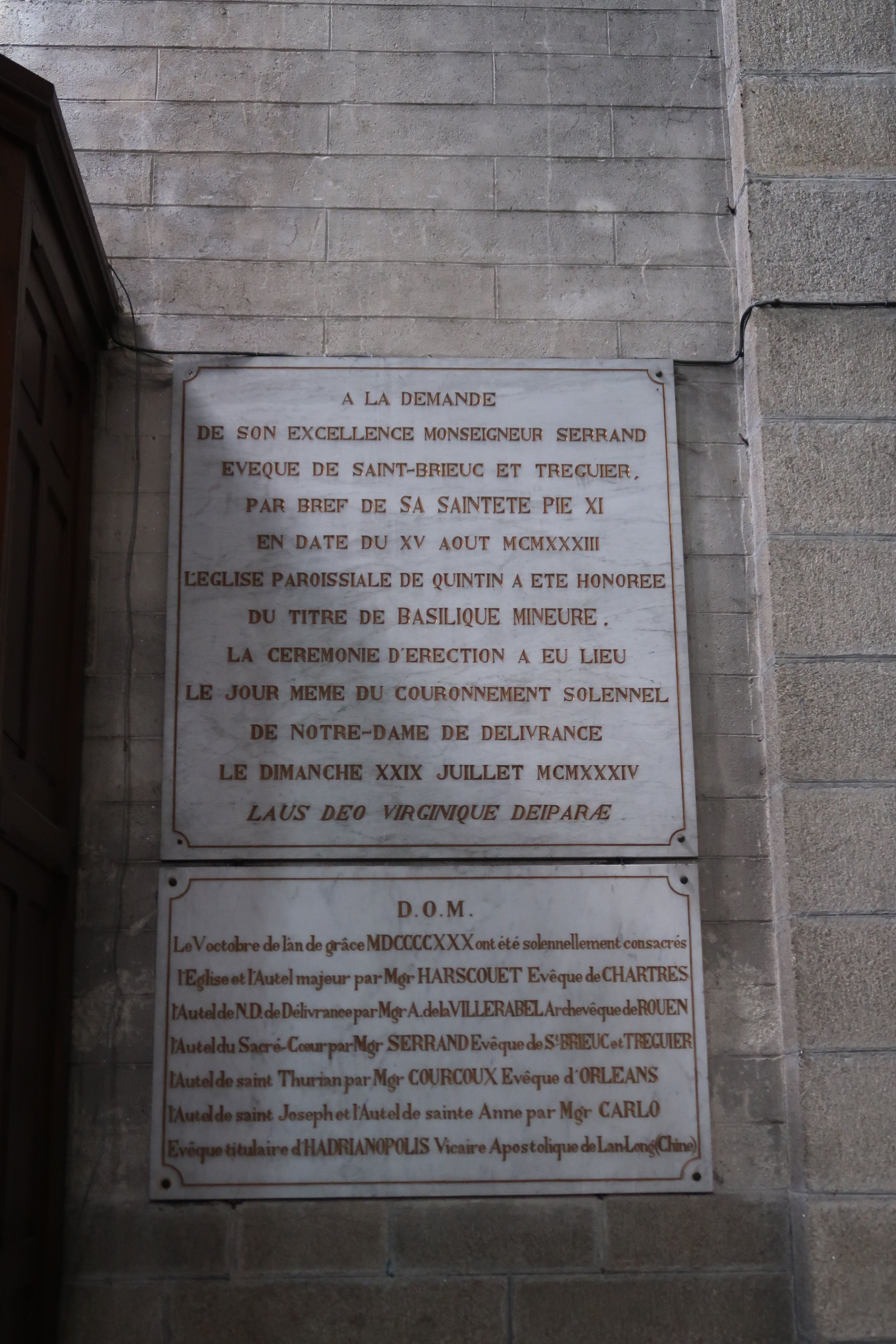 Bras sud du transept : plaques commémorant l'érection de l'église au rang de basilique en 1934 et la consécration de l'édifice et de ses autels en 1930