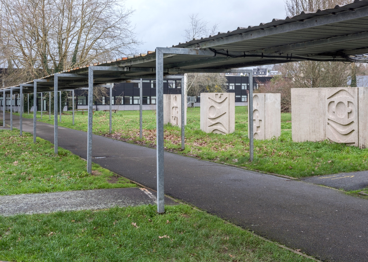 Galerie de circulation couverte, Roger Dhuit, Jean-Claude Dondel, Jean de Jaegher, architectes, 1967. Et mur sculpté, Edgard Pillet, 1970.Immatriculation