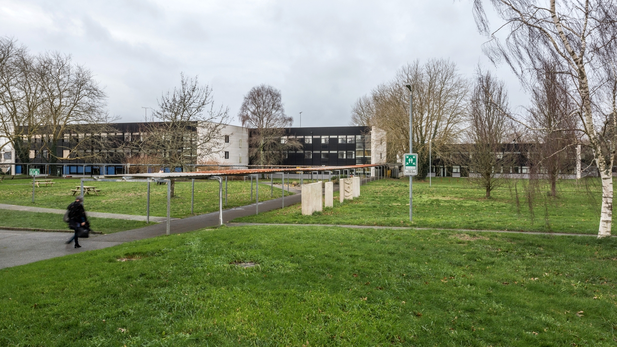 Vue d'ensemble prise de l'est : galerie de circulation, internats, décoration au titre du 1% artistique.Immatriculation