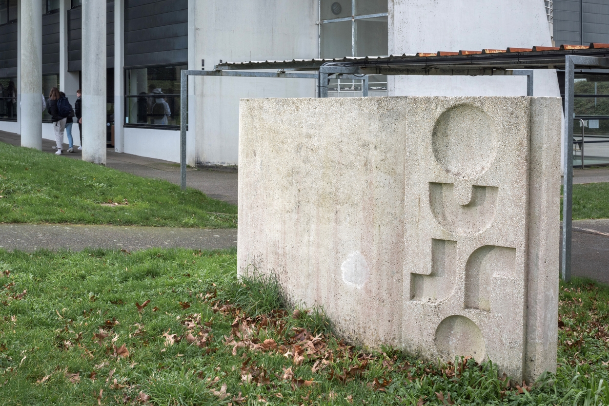 Un élément du mur sculpté, implanté le long de la galerie couverte, entre l'externat et les internats (Edgard Pillet), 1970.Immatriculation