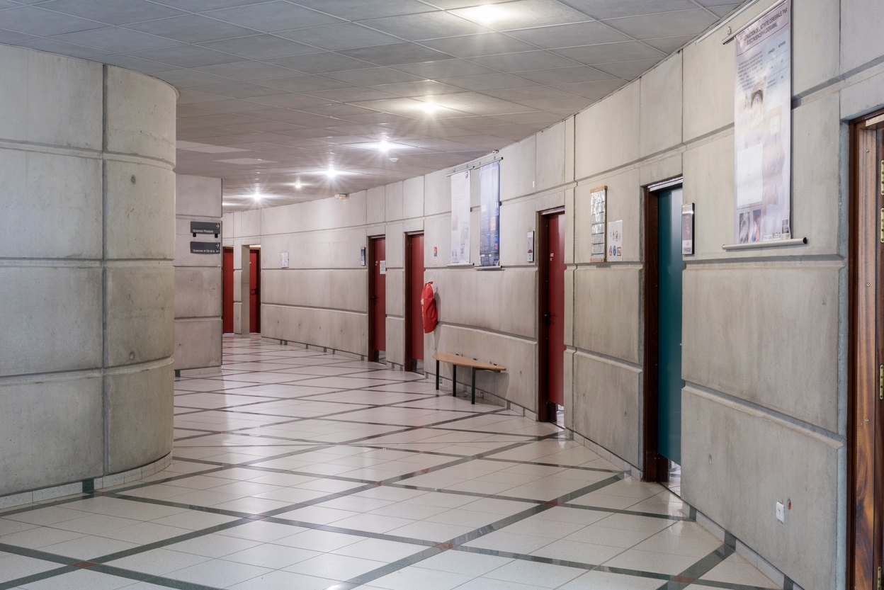 Dégagement : noter l'usage du béton brut et sa modénature. Philippe Brulé et Marc Quéré, architectes, 1997.Immatriculation