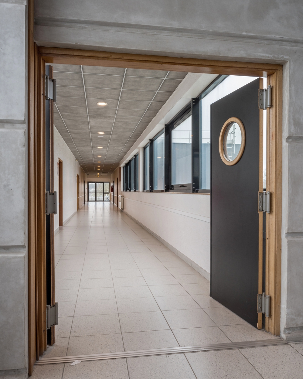 Couloir et portes battantes dotées de hublots. Philippe Brulé et Marc Quéré, architectes, 1997.Immatriculation