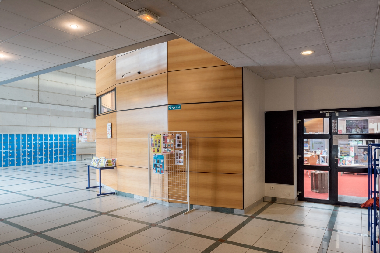 Hall d'entrée et d'accueil : entrée du CDI et casiers des élèves. Philippe Brulé et Marc Quéré, architectes, 1997.Immatriculation