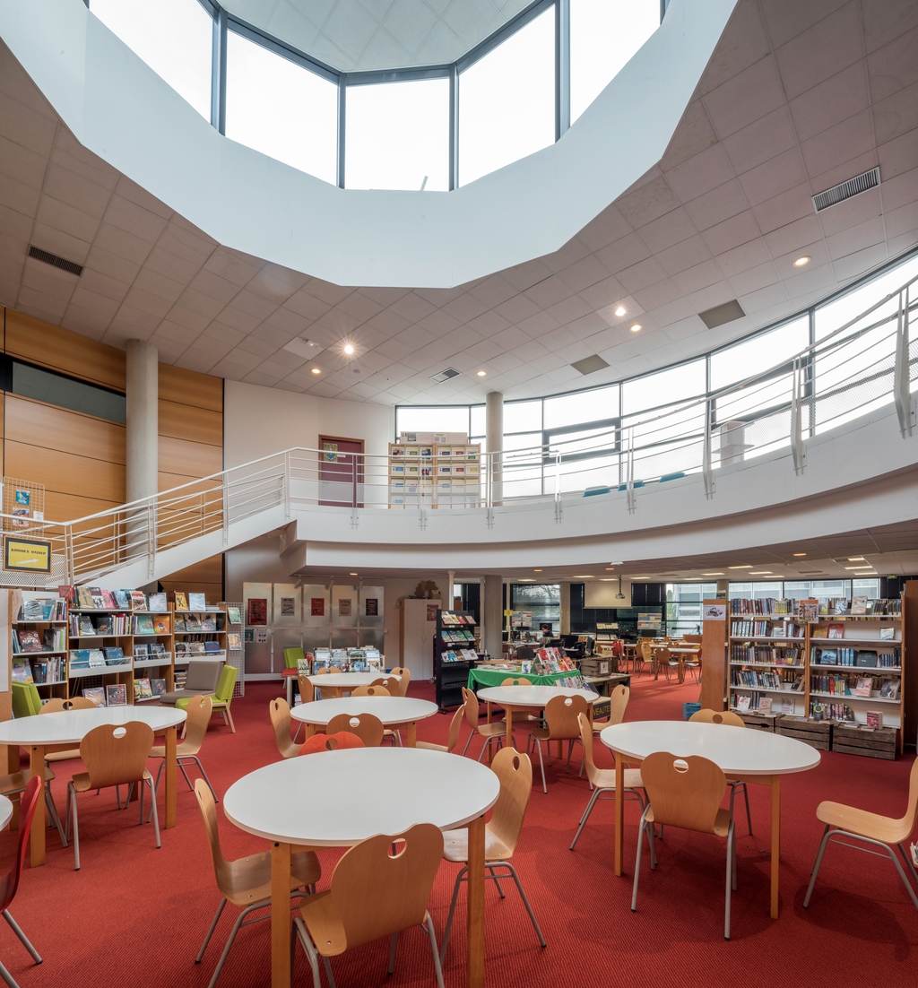 Vue intérieure du CDI. Noter la mezzanine et le lanternon. Philippe Brulé et Marc Quéré, architectes, 1997.Immatriculation