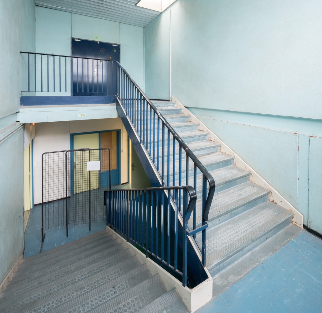 Cage d'escalier dans l'externat des anciens ateliers. Roger Dhuit, Jean-Claude Dondel, Jean de Jaegher, architectes, 1967.Immatriculation