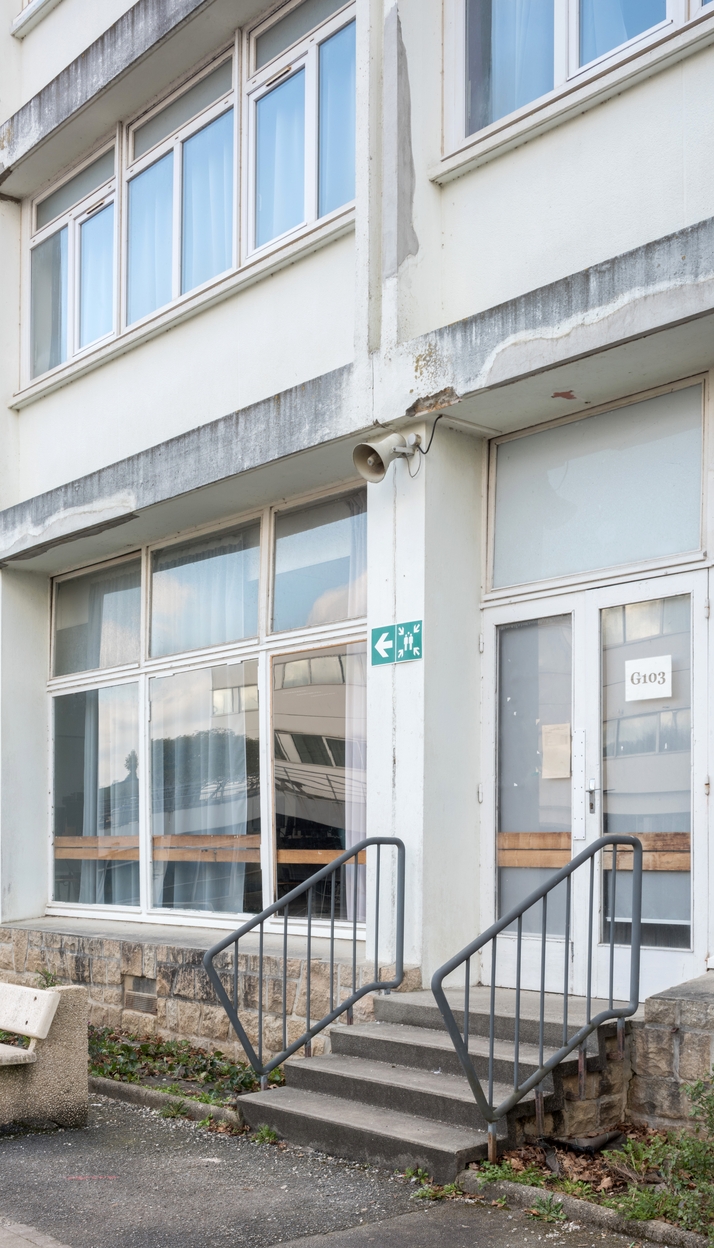 Détail de la façade est de l'internat garçons. Raymond Lopez, architecte, 1958.Immatriculation