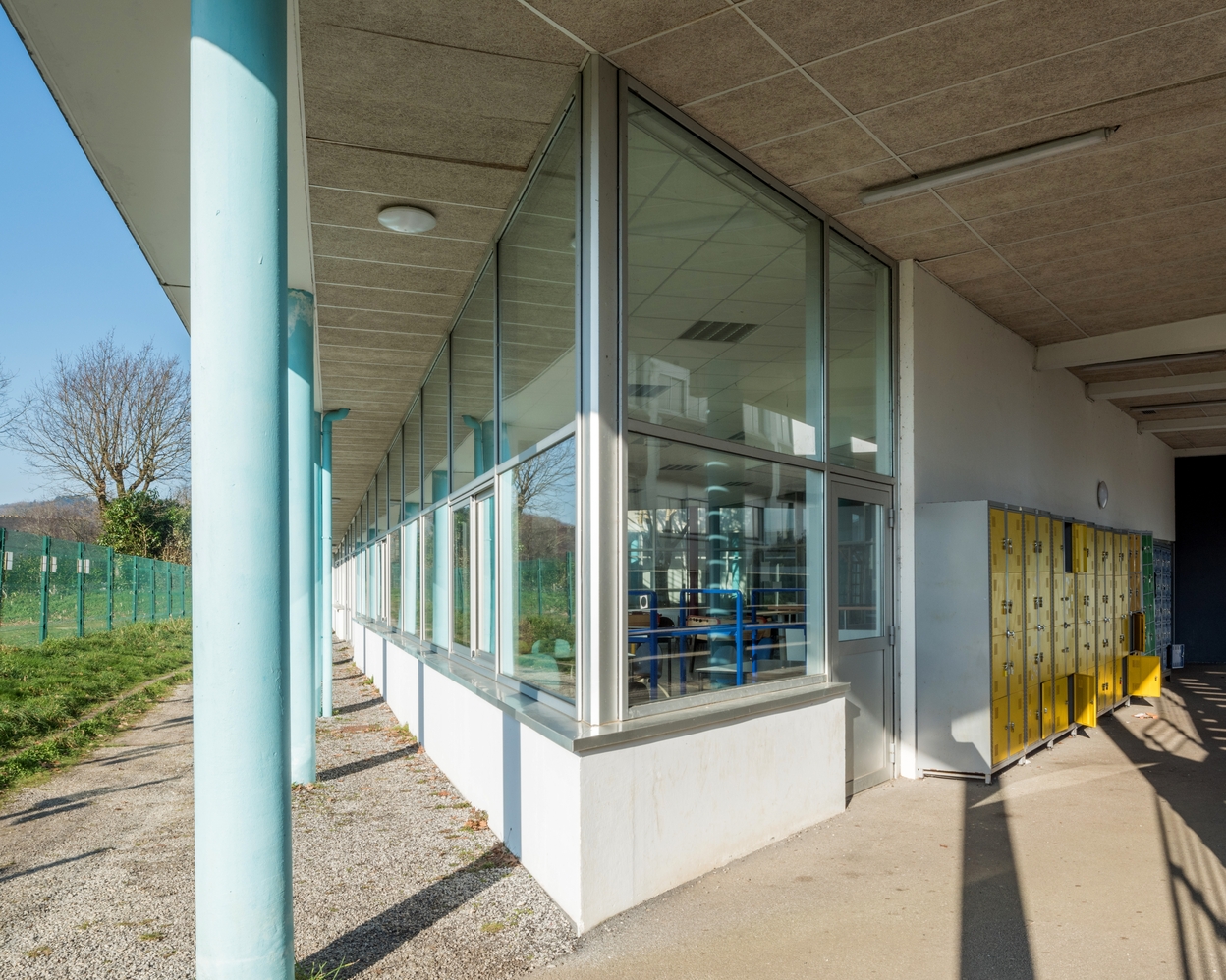 Détail du préau et de la façade sud de l'externat de 2001 (P. Ruelland et M. Quéré, architectes) : foyer des élèves.Immatriculation