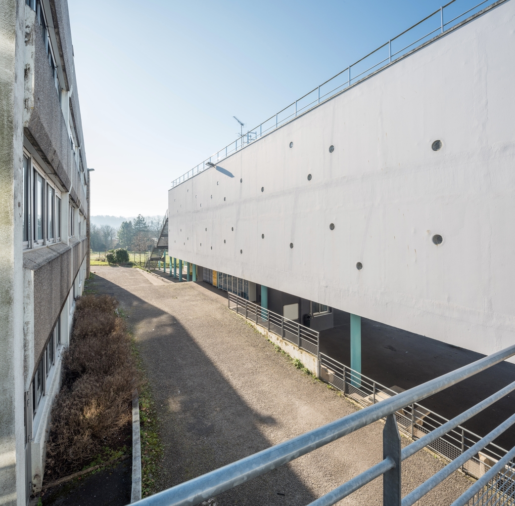 Façade est de l'externat de 2001 (P. Ruelland et M. Quéré, architectes). Vue prise le long de la façade ouest de l'externat du collège.Immatriculation