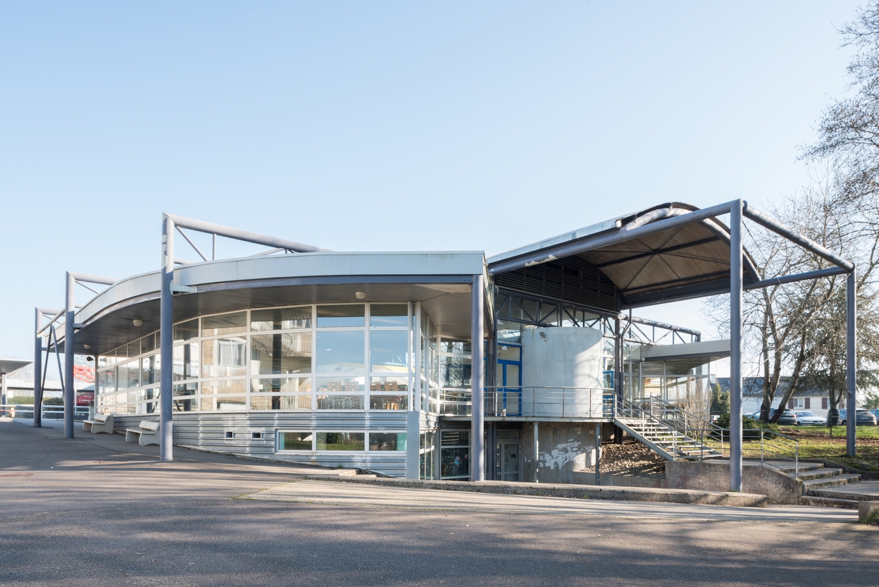Vue d'ensemble du service de restauration, prise du sud-ouest. Paul Ruelland et Michel Quéré, architectes, 1989.Immatriculation