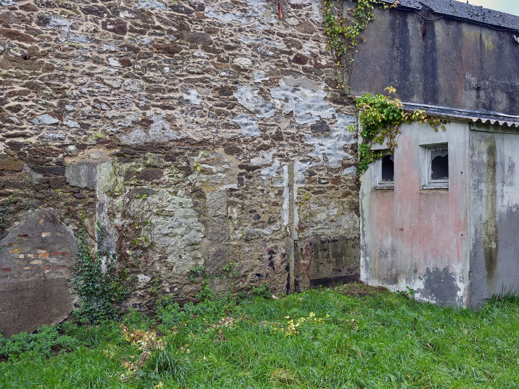 Vue de détail du mur de clôture à l'est : porte murée débouchant rue de Pontaniou. A droite, bâtiment accolé au mur de clôtureImmatriculation