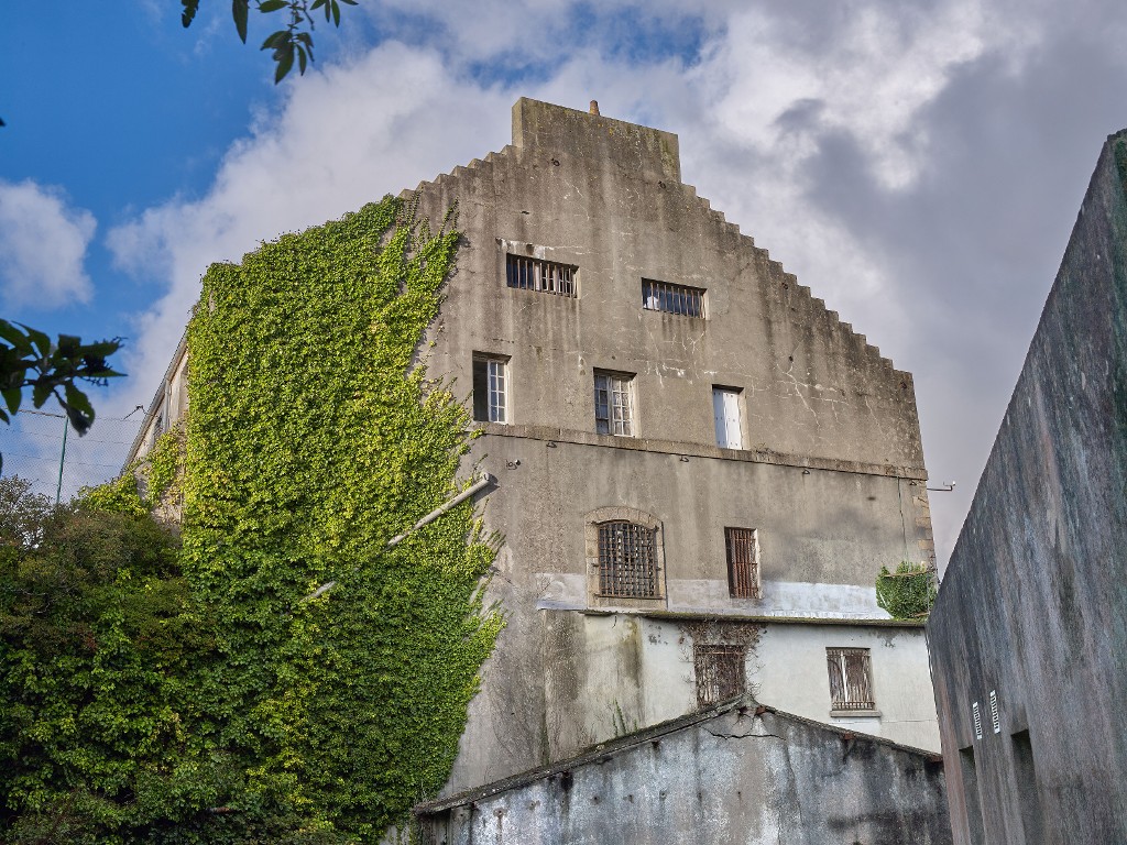 Vue du pignon sud du bâtiment carcéral : le lierre grimpant gagne peu à peu sur l'enduit... Son pignon découvert est en gradinImmatriculation