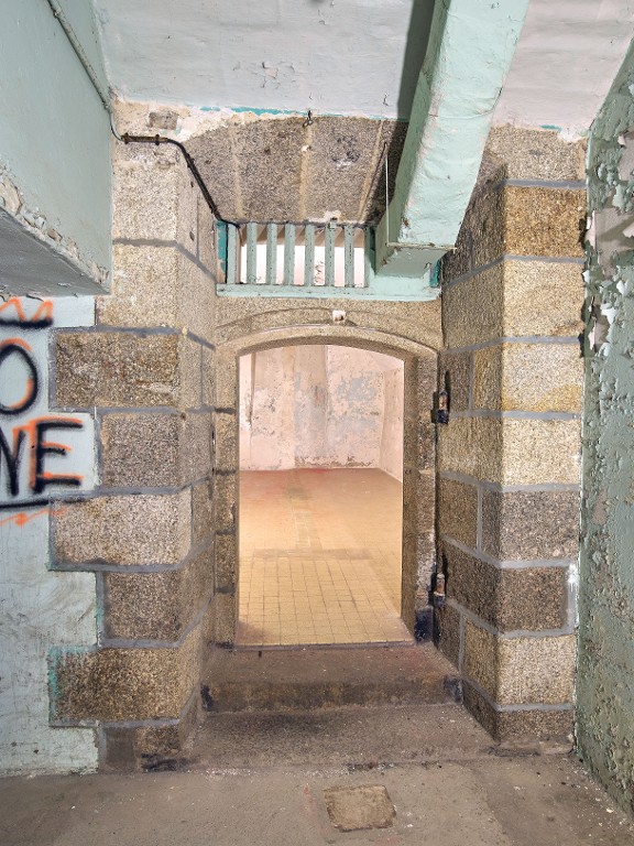 Vue de l'entrée de l'une des pièces voûtées du rez-de-chaussée (n° 3 en partie effacé). Son imposte est dotée de barreaux verticaux ; un conduit distribuait de l'air chaud dans la pièceImmatriculation