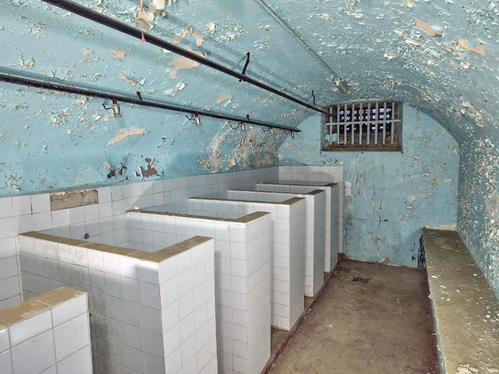 Vue de la pièce voûtée du rez-de-chaussée donnant dans la cour ouest. A gauche, les douches individuelles carrelées ; à droite, un banc. Au sol, cimentImmatriculation