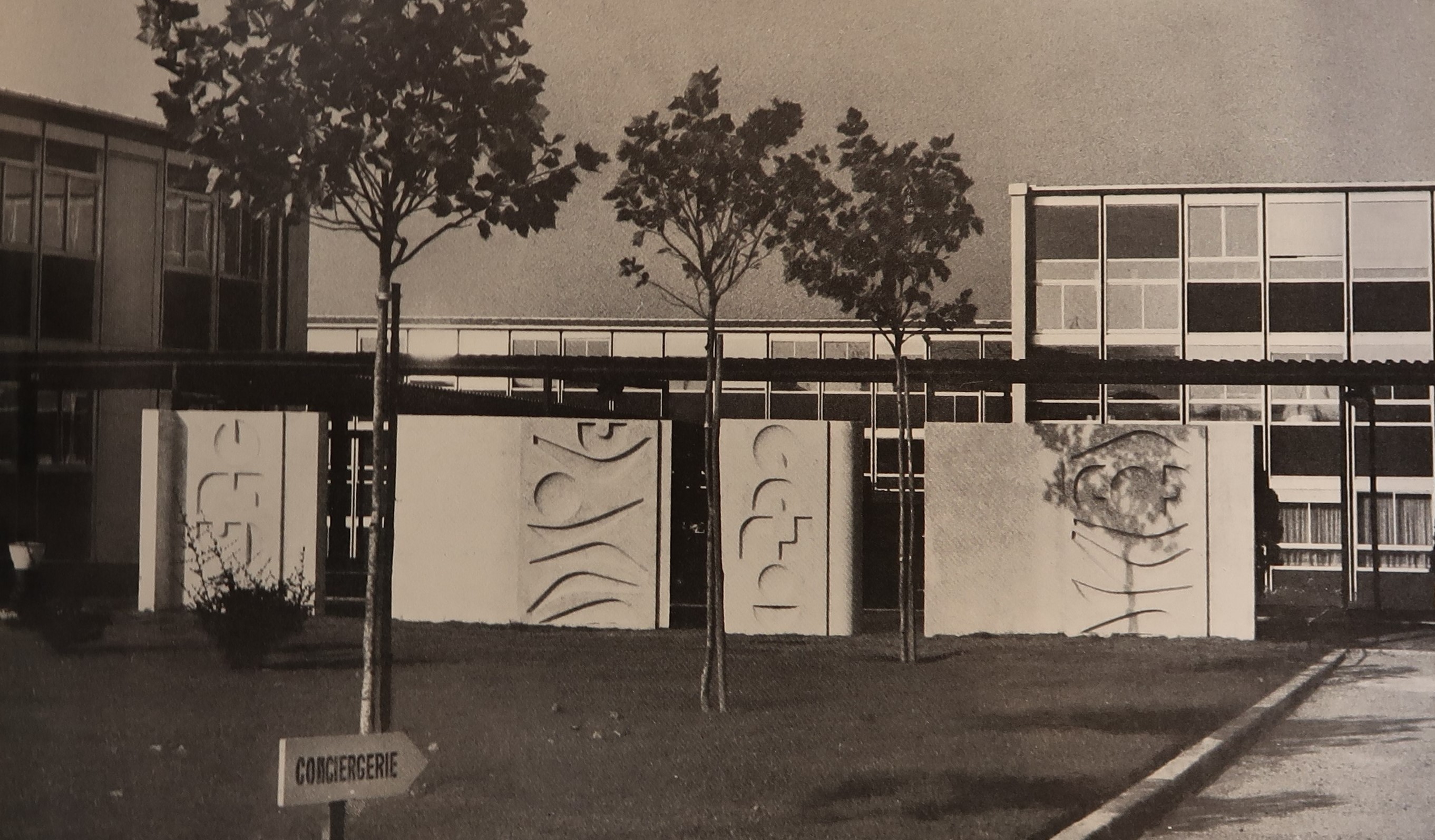"C.E.T. Quimperlé, Finistère. - Eléments muraux, ciment-pierre. Architecte : Roger Dhuit". Vue du 1% du lycée Kerneuzec, publiée dans le livre :"Pillet. Sculptures dans l'Architecture" en 1974 (p. 19). Cette photographie offre une vision de bâtiments disparus lors de la restructuration de 1997 : à gauche, administration et logements, au centre externat des classes techniques, à droite, externat du second degré..Immatriculation