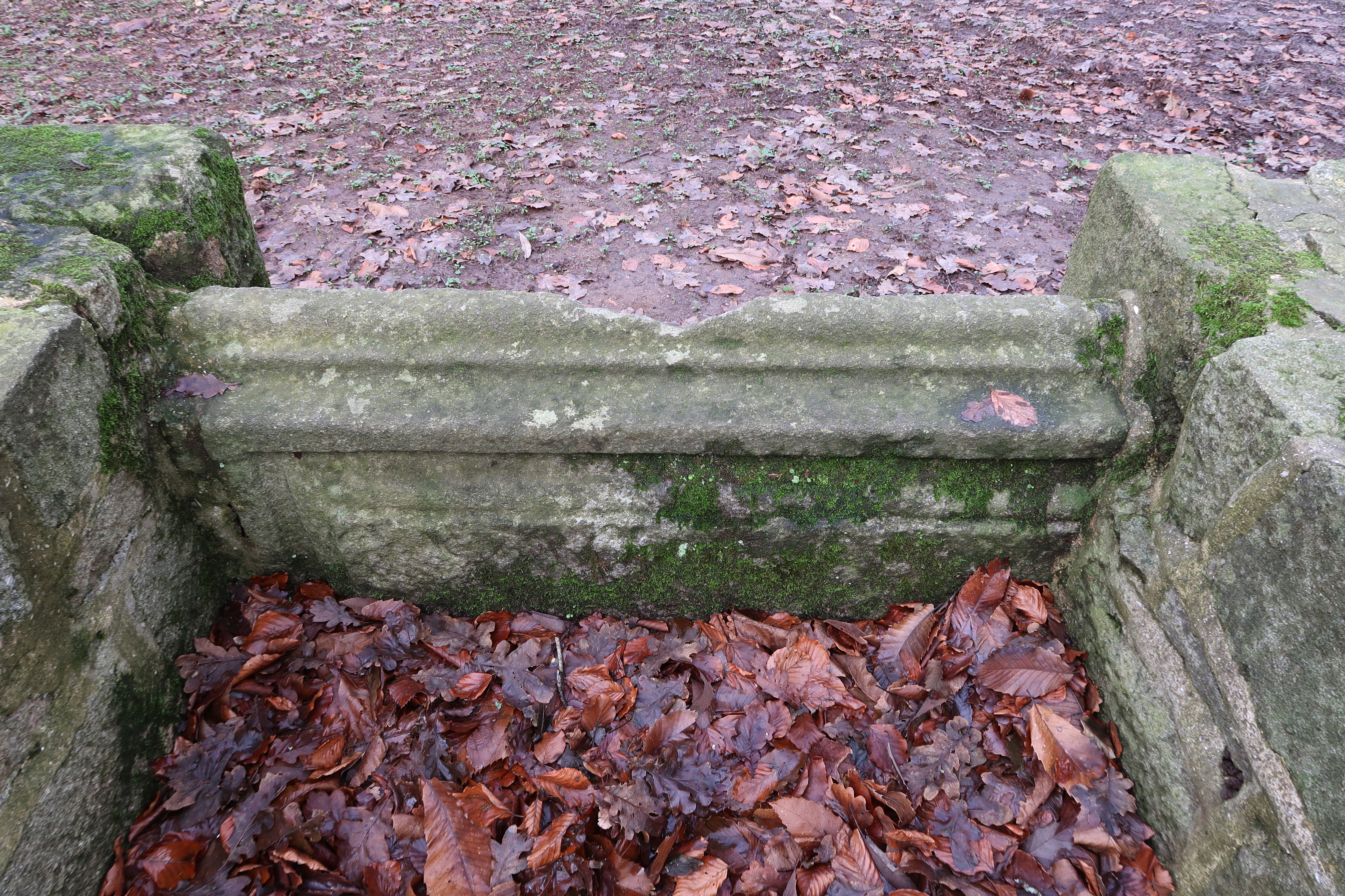 Vue de détail de l'enclos de plan cruciforme : remploi d'une pierre moulurée de la chapelle comme échalierImmatriculation