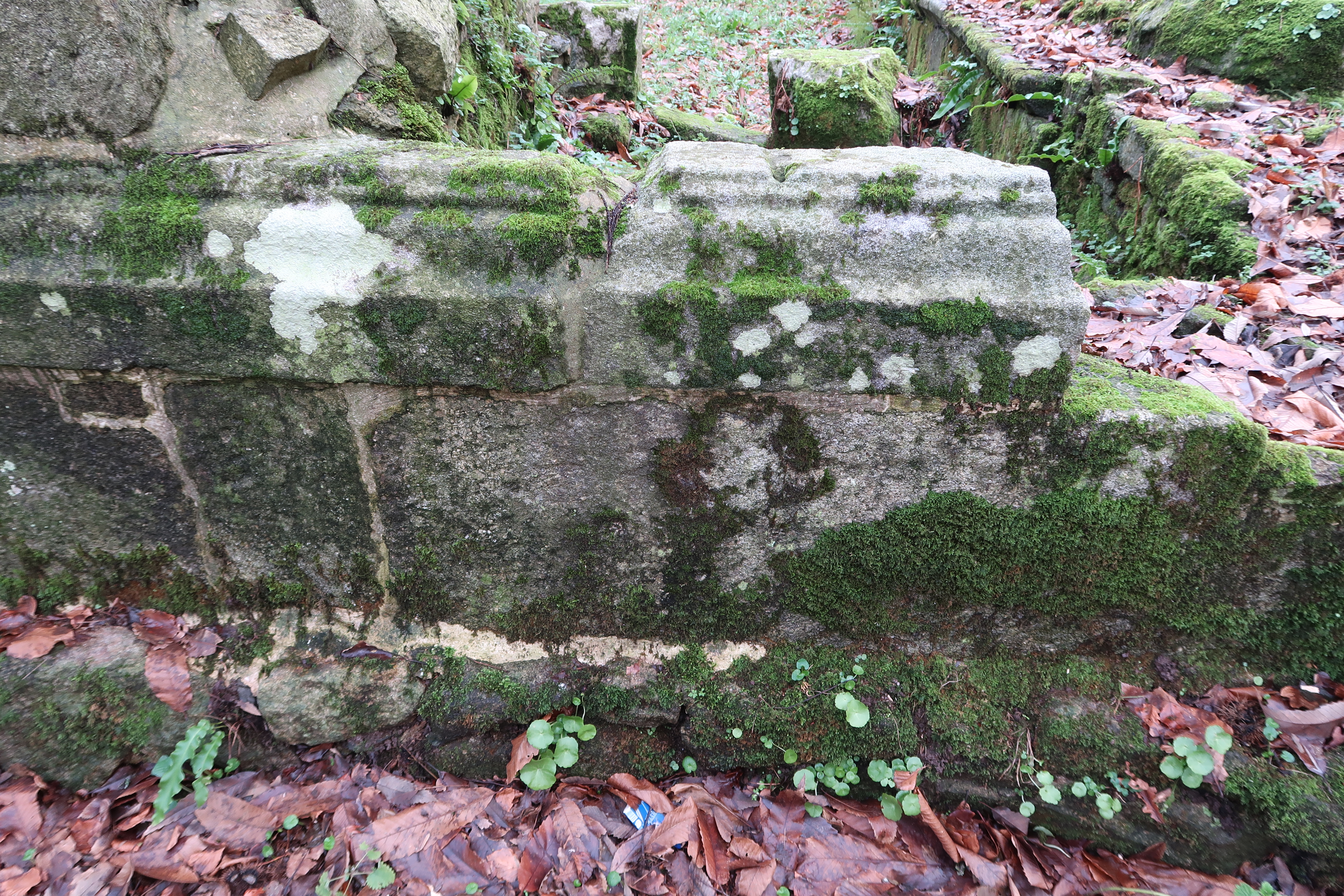 Vue de détail du mur ouest (portail) : pierres de taille moulurées sur des fondations en moellonImmatriculation
