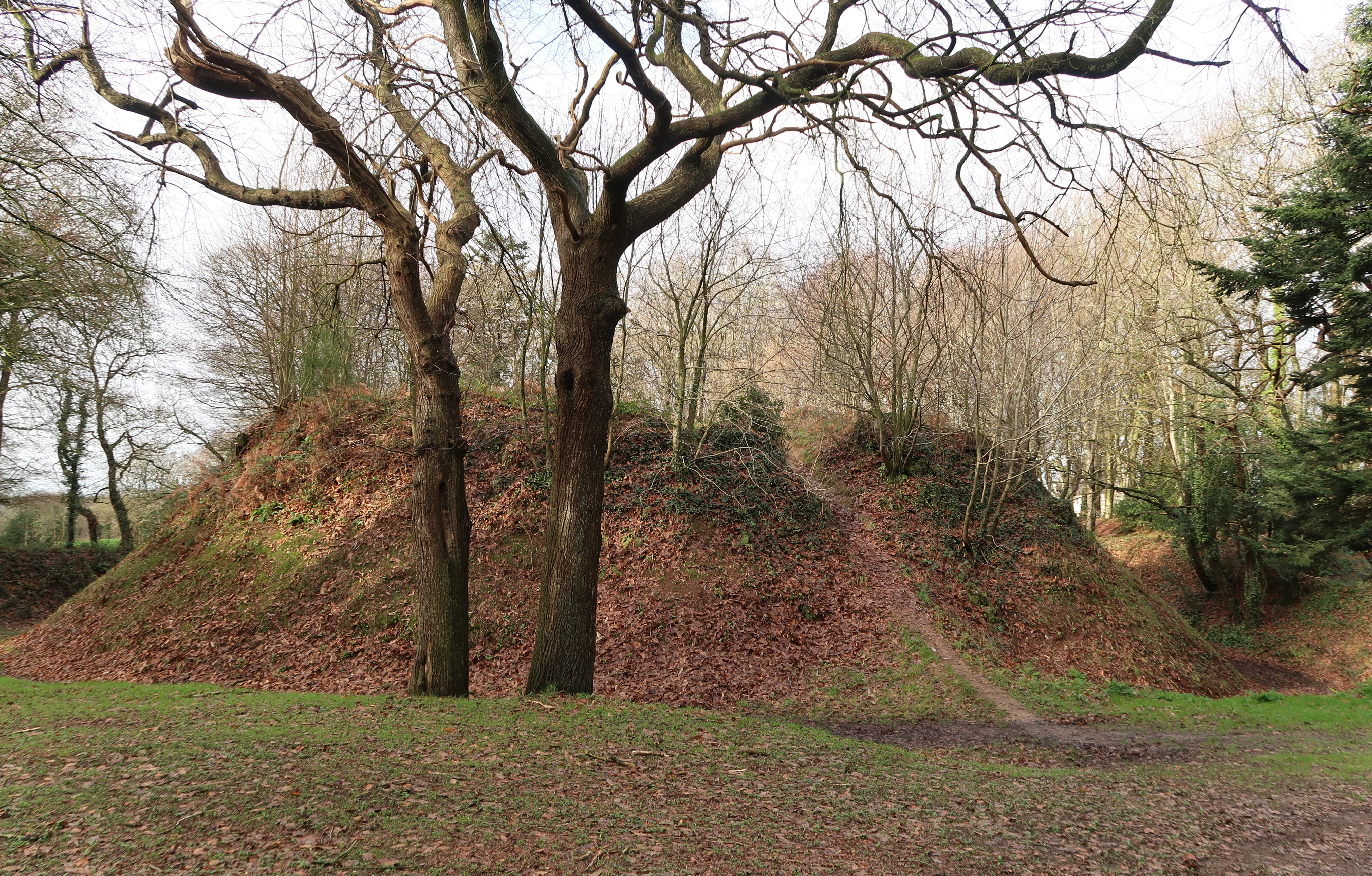 Vue générale de la motte depuis le sud, état dans l'hiver 2023. Elle est entourée d'un fossé annulaireImmatriculation
