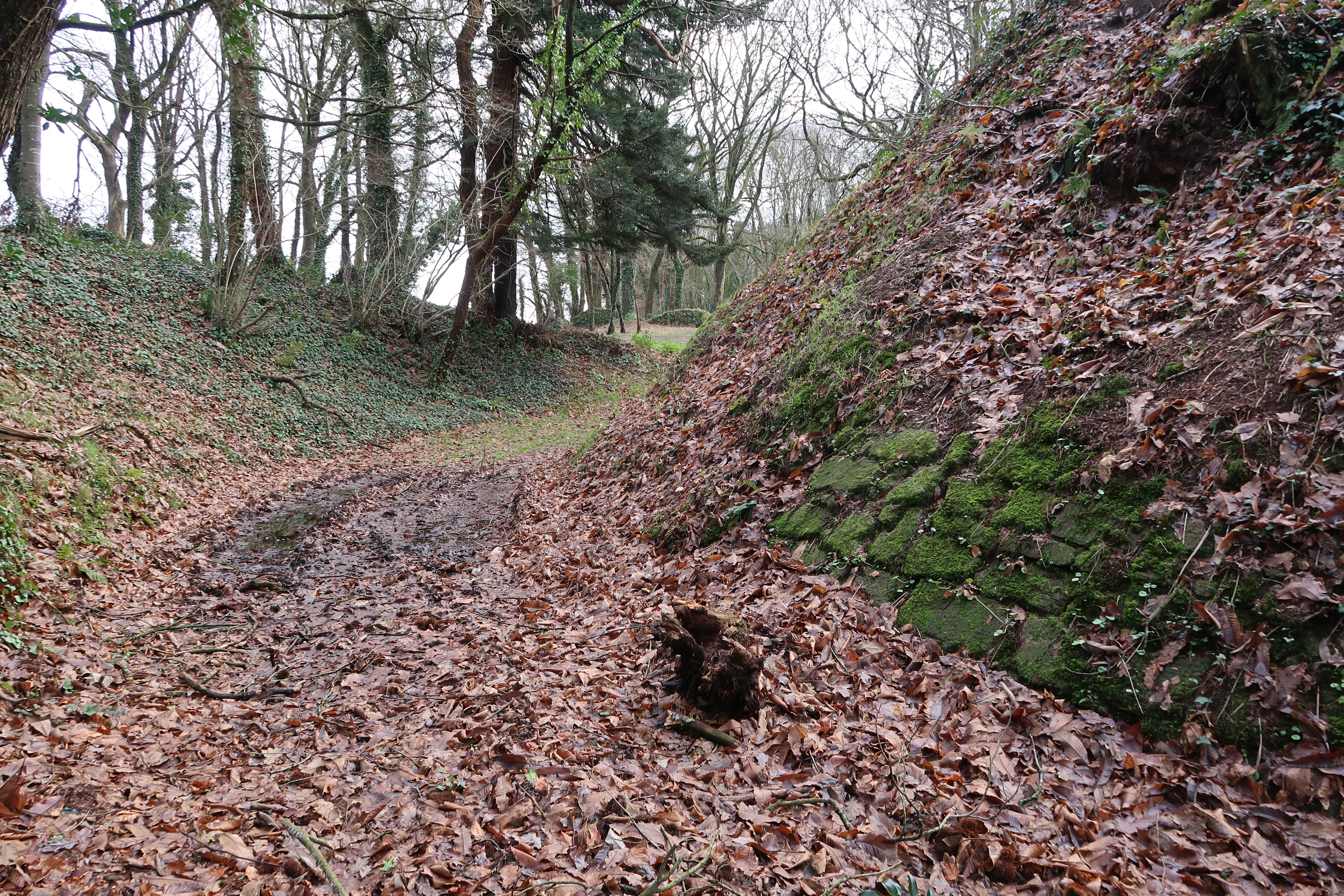 Vue de la motte et du fossé annulaire, état dans l'hiver 2023. La partie basse de ces flancs est partiellement appareillée de moellon : ici le nordImmatriculation