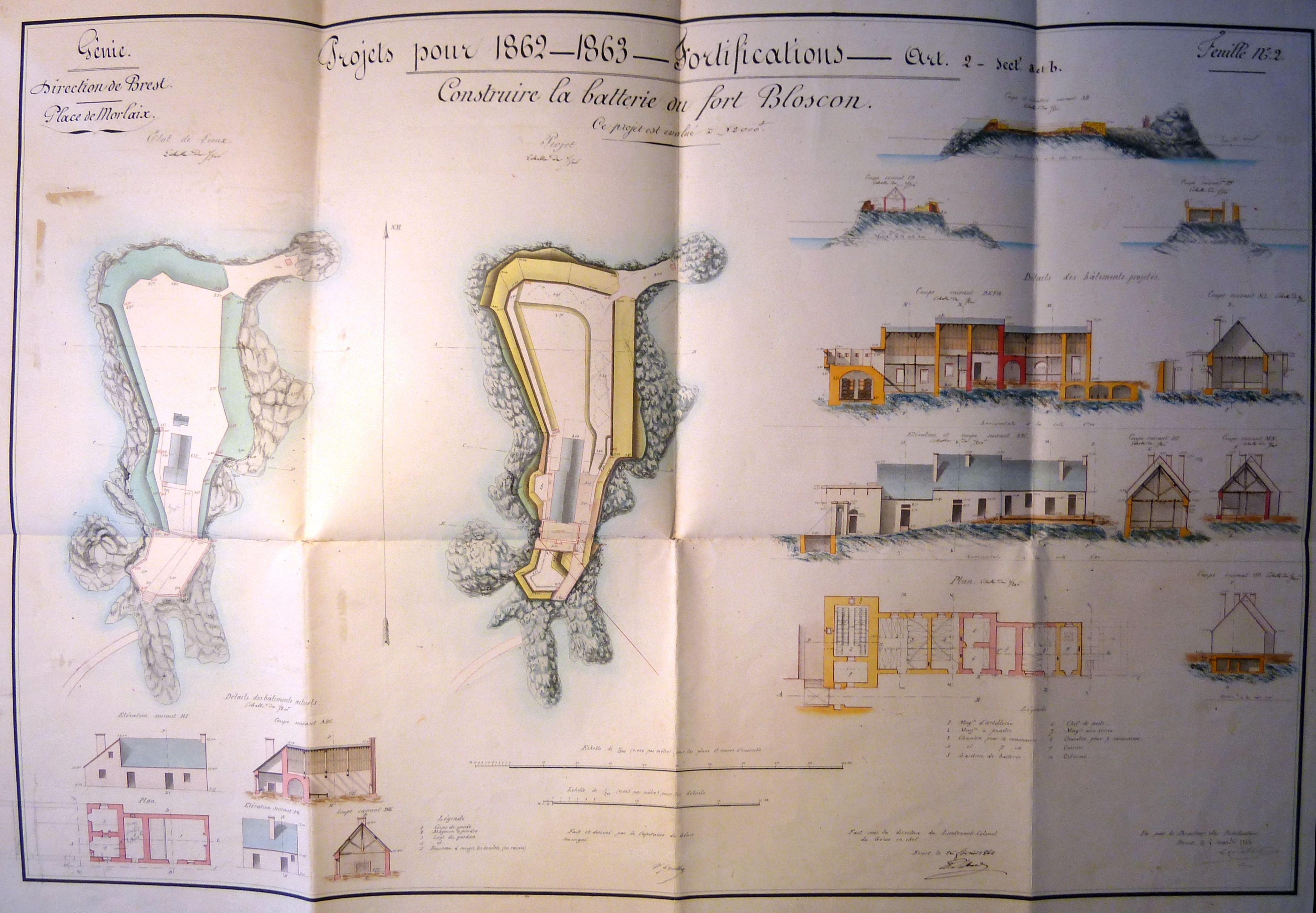 Morlaix. Projets des travaux à effectuer aux bâtiments militaires de la place et aux batteries de côtes en dépendant : mémoires, états, correspondance, plans. Batterie du fort de Bloscon. 1848-1875. Projets pour 1862-1863, 26 février 1862 (Génie, Direction de Brest, Place de Morlaix).