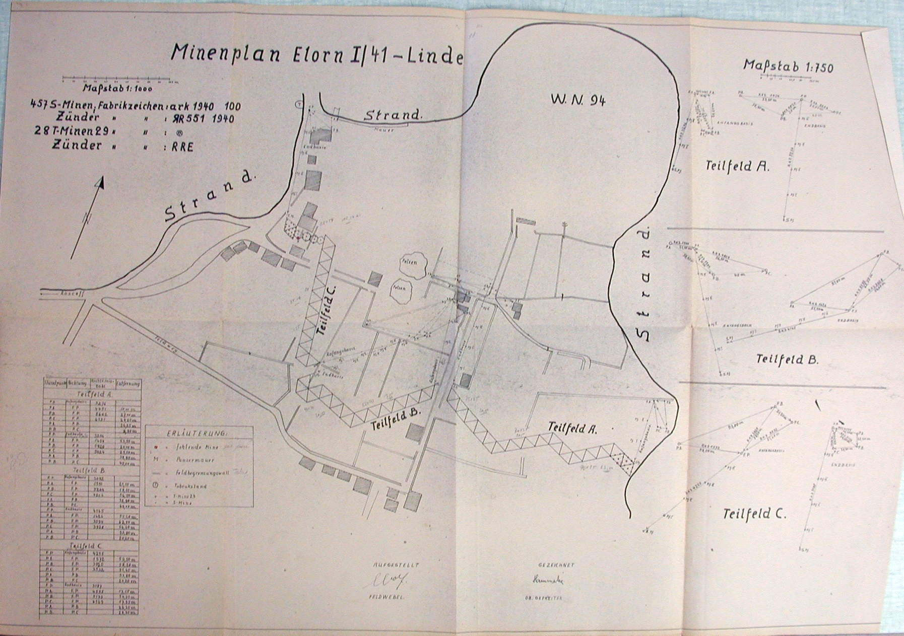 Plan de détail du champ de mines Elorn I/41 "Linde" (tilleul) divisé en trois sections A, B et C posé le 20 février 1943 au-delà d'An Diou Roc'h