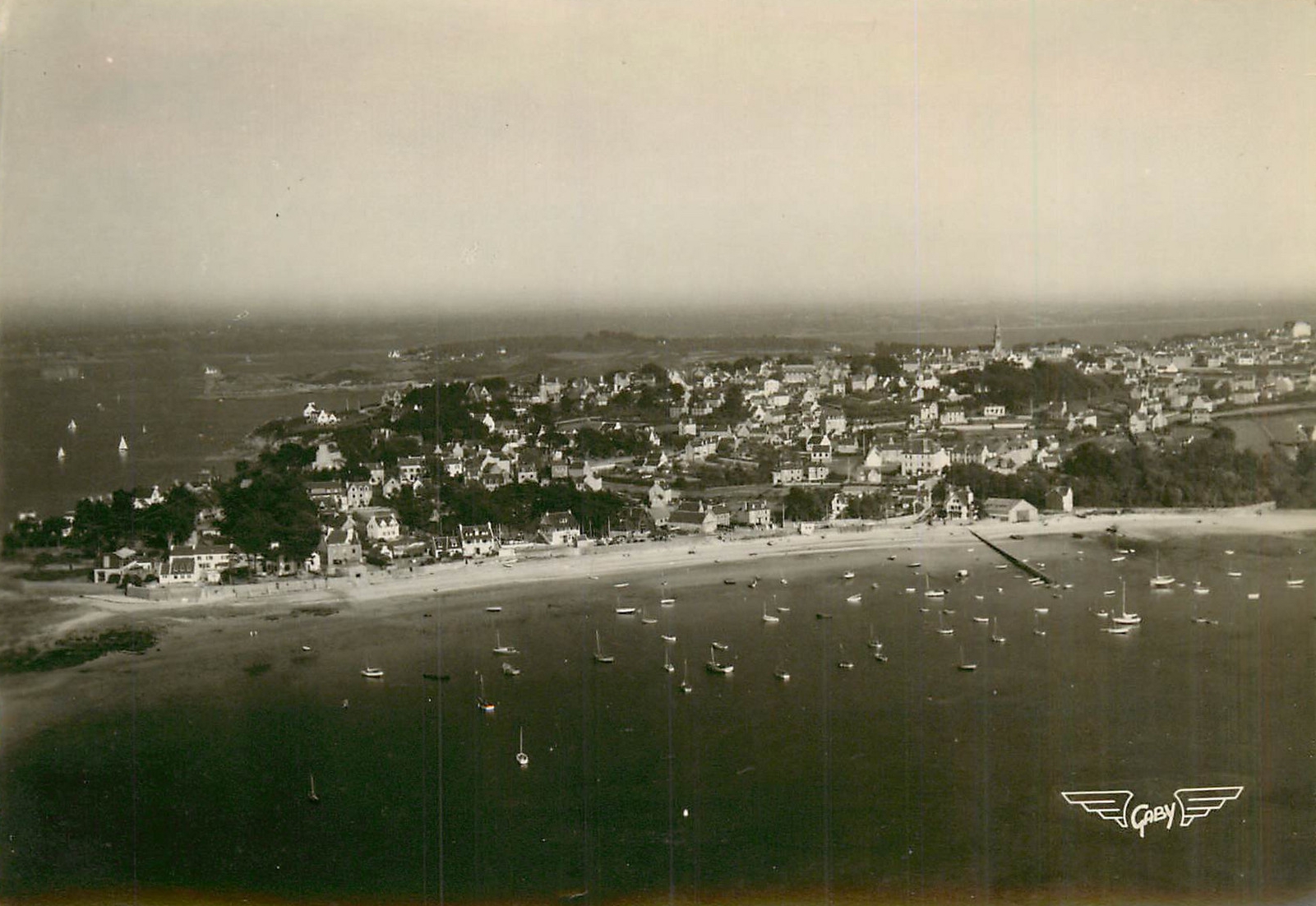 Vue aérienne oblique du Port de Carantec et de l'île Callot, carte postale, éditions Gaby. Le bunker - casemate n'a pas encore été couvert par une extensionImmatriculation