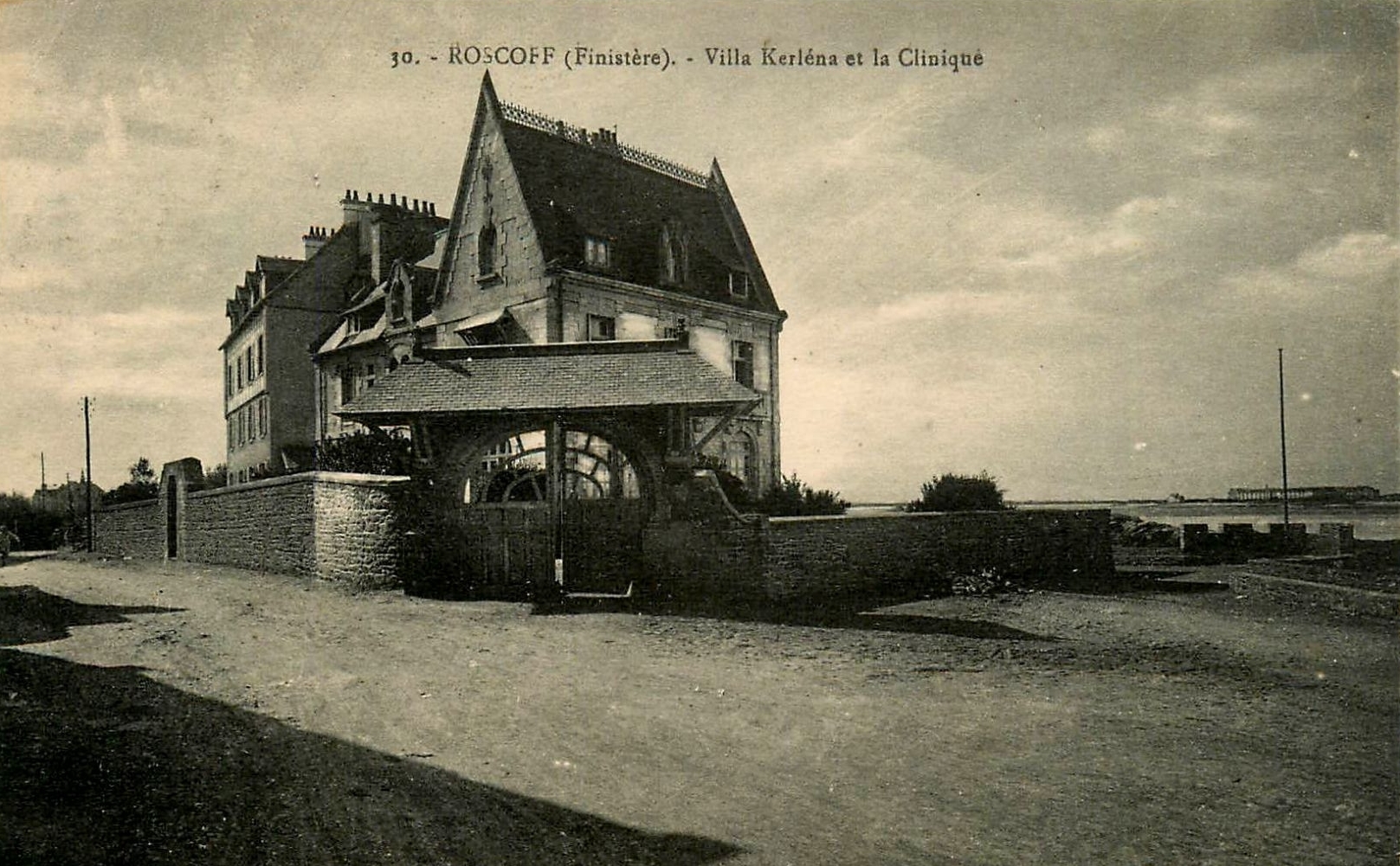 Vue de la Villa Kerléna et de la clinique, carte postale. A droite, le mur de soutènement surmonté d'un crénelage avec un mât de pavillonImmatriculation