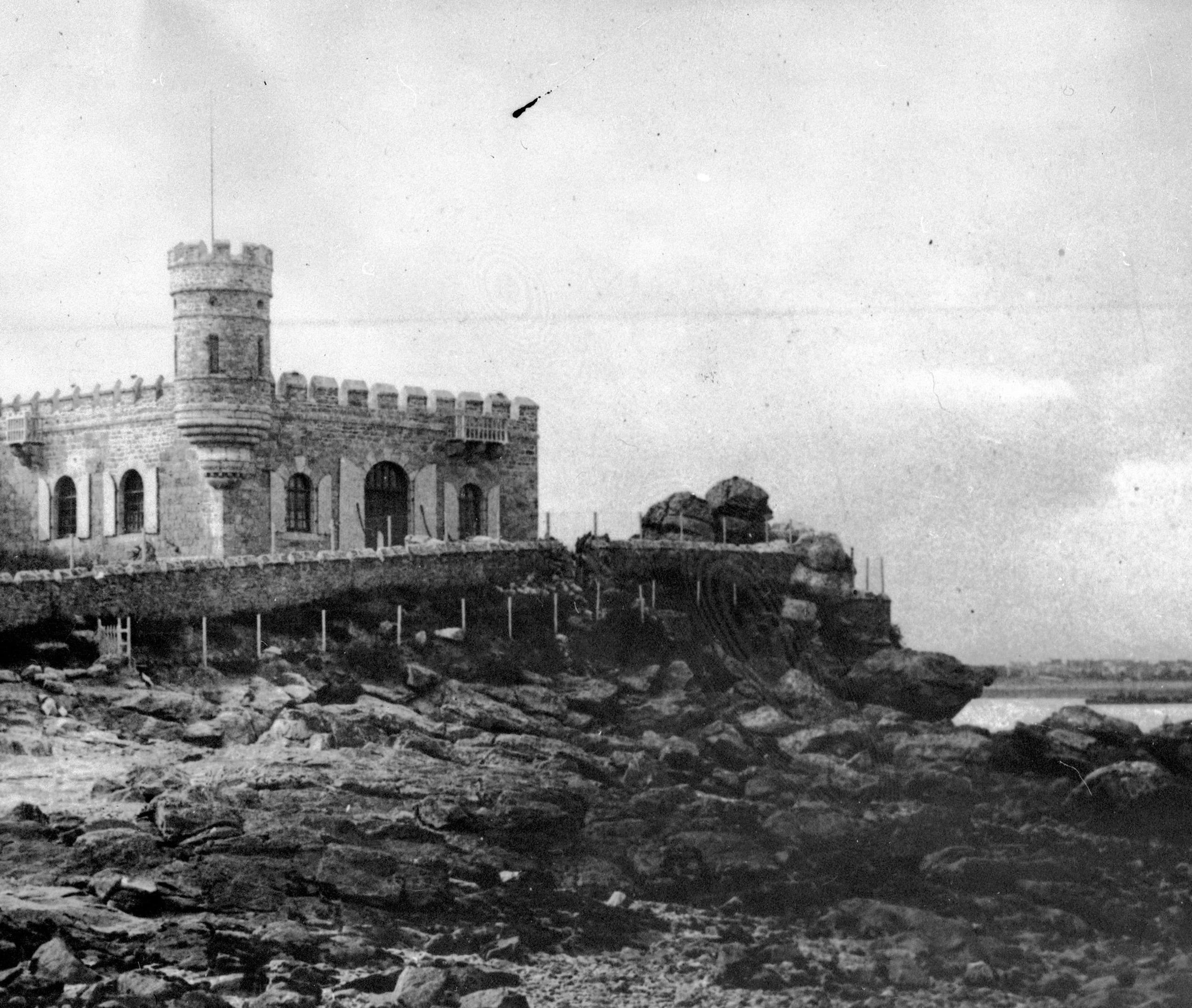 Vue générale à marée basse, vers 1914, détail d'une carte postale. L'ancien corps de garde est flanqué d'une tour créneléeImmatriculation