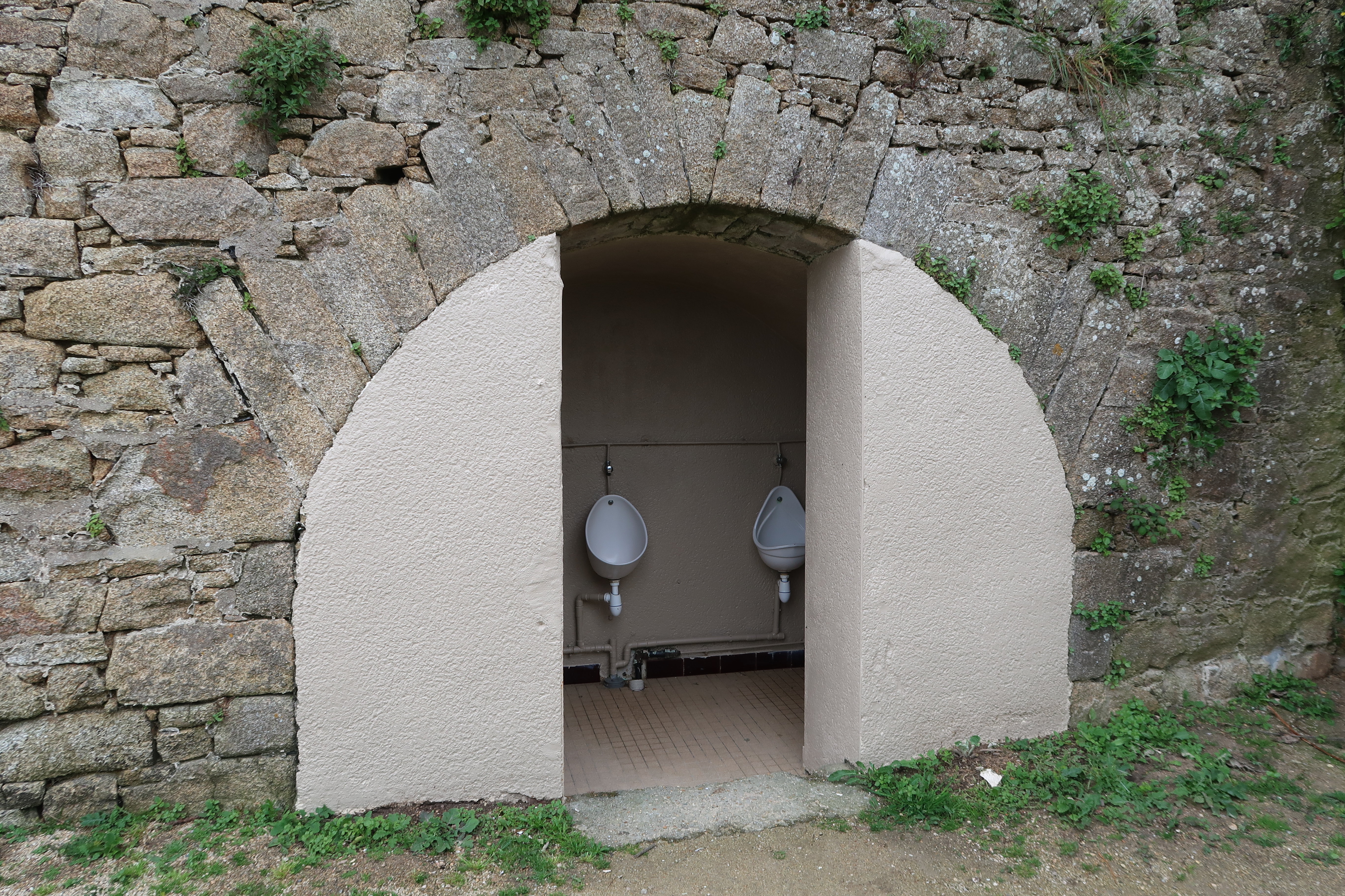 Vue de l'élévation Ouest : accès en arc plein cintre de l'ébraisoir Nord faisant gueule de défournement (état en 2023). Il a été transformé en toilettes publiquesImmatriculation