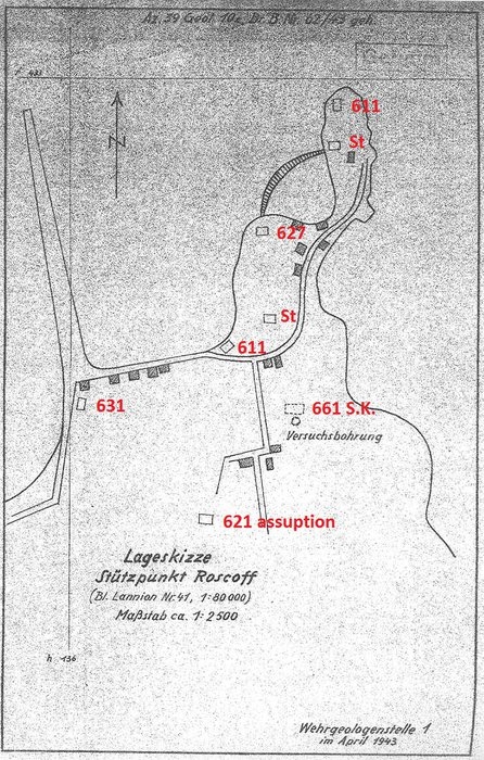 Carte de situation (Lageskizze) du Stützpunkt Roscoff, avril 1943 (les numéros des plans-types ont été ajoutés par Jopaerya, membre de Axis History Forum)
