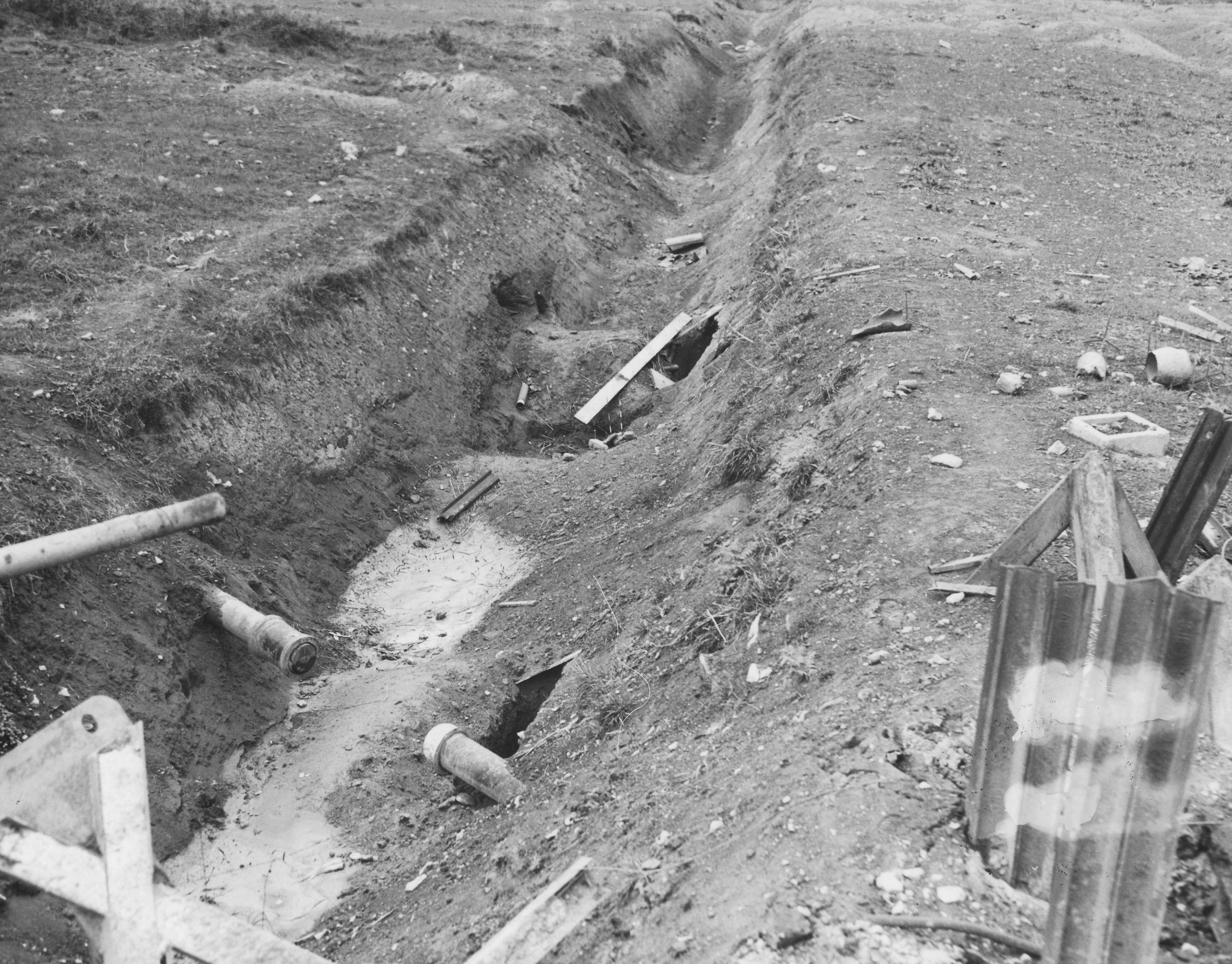Vue du fossé anti-char depuis la route vers l'Ouest (United States Army Signal Corps, septembre 1944). A droite (au nord immédiat du fossé), plusieurs chausses-trappes ont été rassemblésImmatriculation