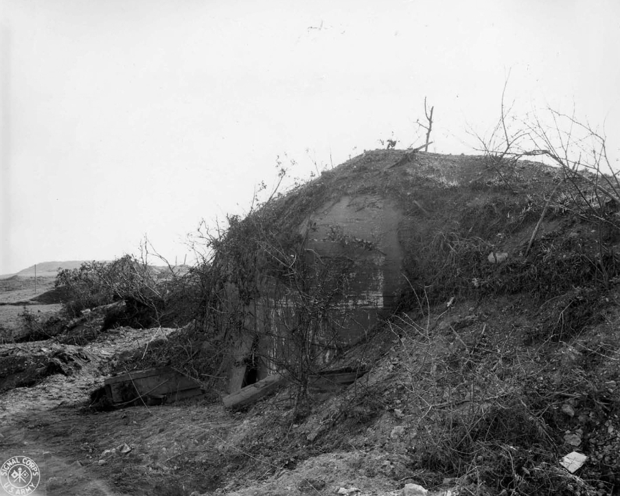 Vue de profil du bunker - casemate, variante du type 667 (United States Army Signal Corps, septembre 1944). Cette photographie a été identifiée en 2022 par Ludovic Le Braz et Simon RoudotImmatriculation