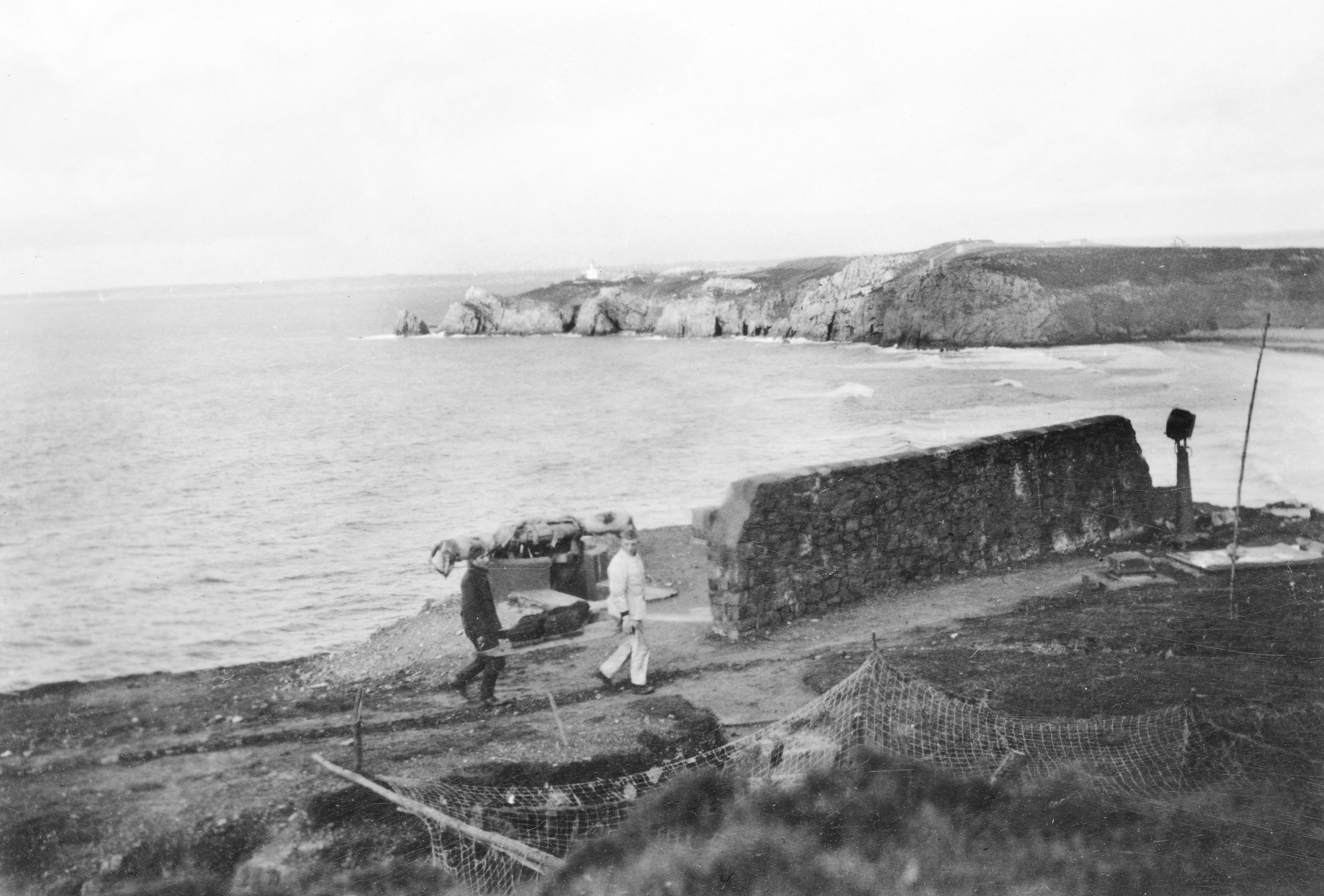 Vue du télémètre (la cuve existe toujours) à côté du poste de direction de tir français avant la construction du bunker - poste de direction de tir de type de type M162a. Deux soldats transportent des caisses de munitions (?) sur un brancart en bois. A droite, un projecteur. En arrière-plan, la pointe du ToulinguetImmatriculation