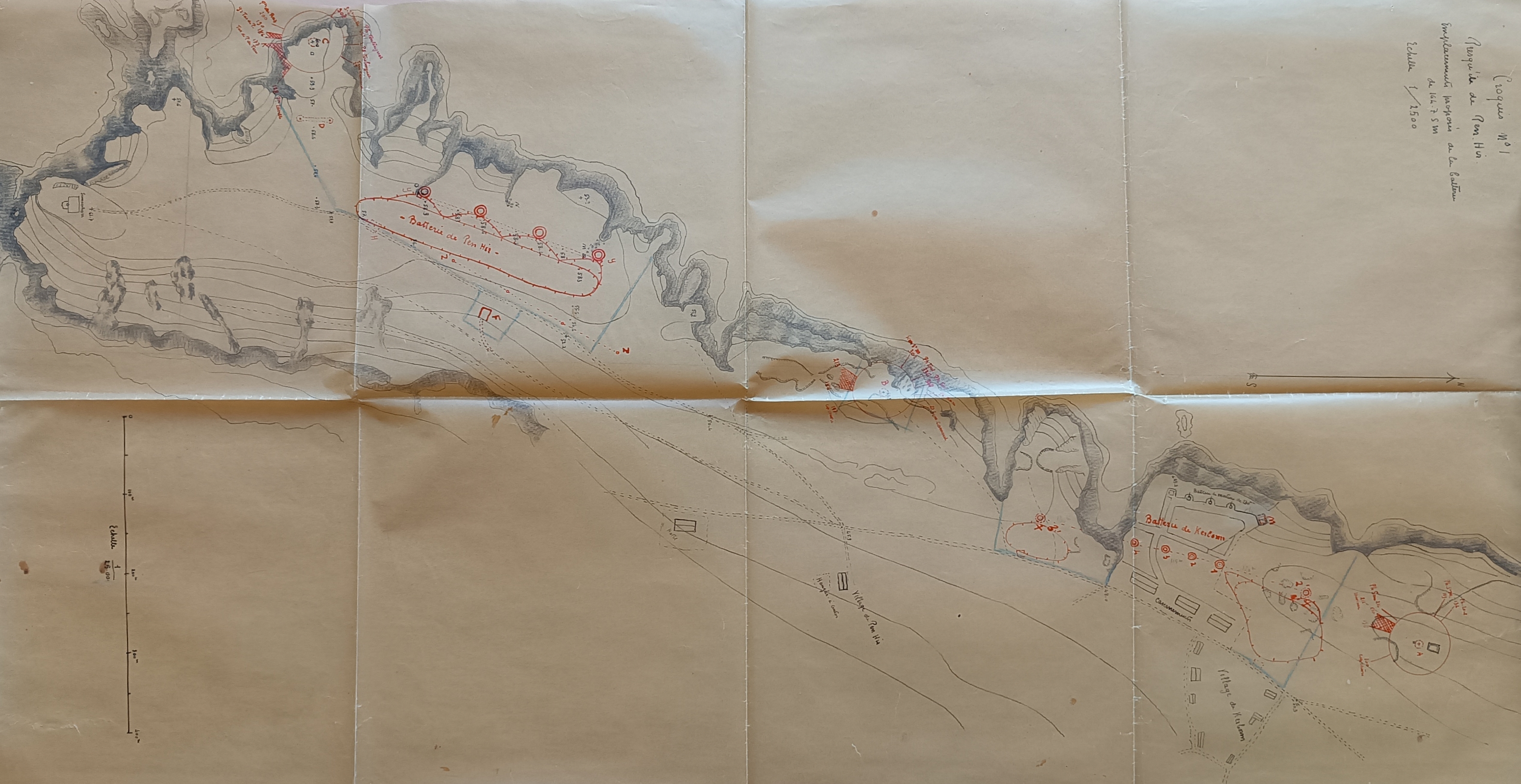 Plan de la pointe de Pen Hir à Camaret : représentation schématique des emplacements proposés pour la batterie de canon de 164 mm, 1926.