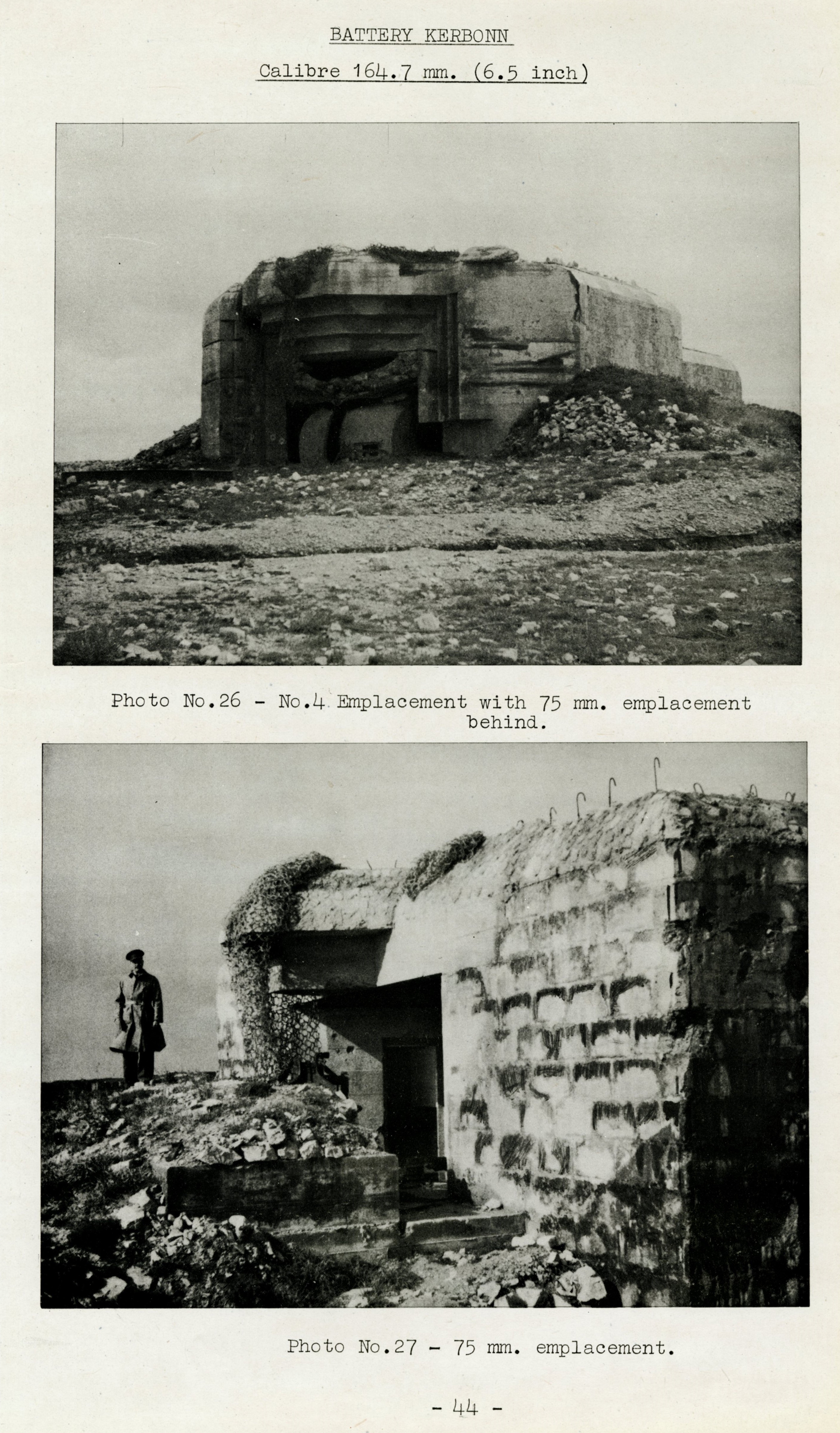 Extrait du rapport "defences report No 1" réalisé après-guerre par les Forces armées britanniques : photographies de l'un des trois bunkers casemates pour canons de 164 mm et 75 mm, p. 44Immatriculation
