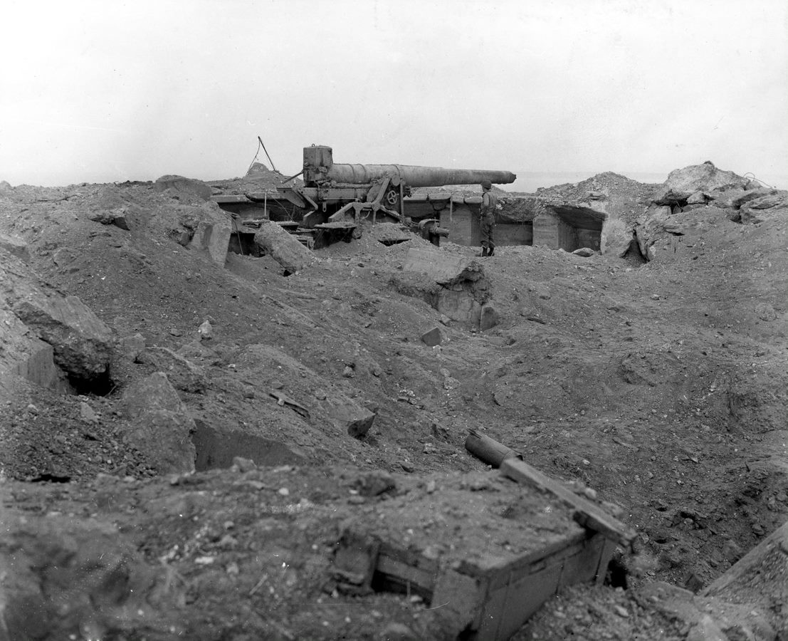 Vue de l'une des quatre cuves pour canon de 22 cm en cours d'examen par un soldat américain de la 8e Division d'Infanterie (8th Infantry Division), 21 septembre 1944. La cuve a été détruite par les bombardements mais l'imposant canon est toujours en placeImmatriculation