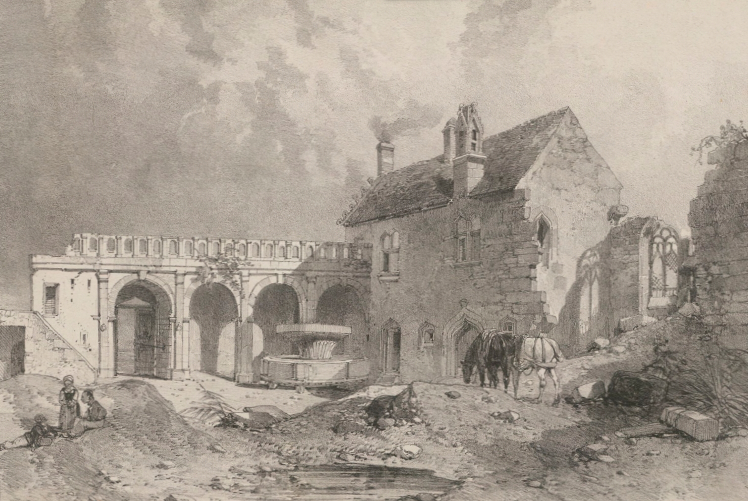 Gravure d'Auguste Mayer dans Voyages pittoresques et romantiques dans l'ancienne France, Bretagne, vers 1845-1846 : vue de la cour intérieure avec sa galerie, la porte de la cour, un logis et les vestiges de la chapelle (collection : Gallica). La fontaine comporte deux bassins superposésImmatriculation