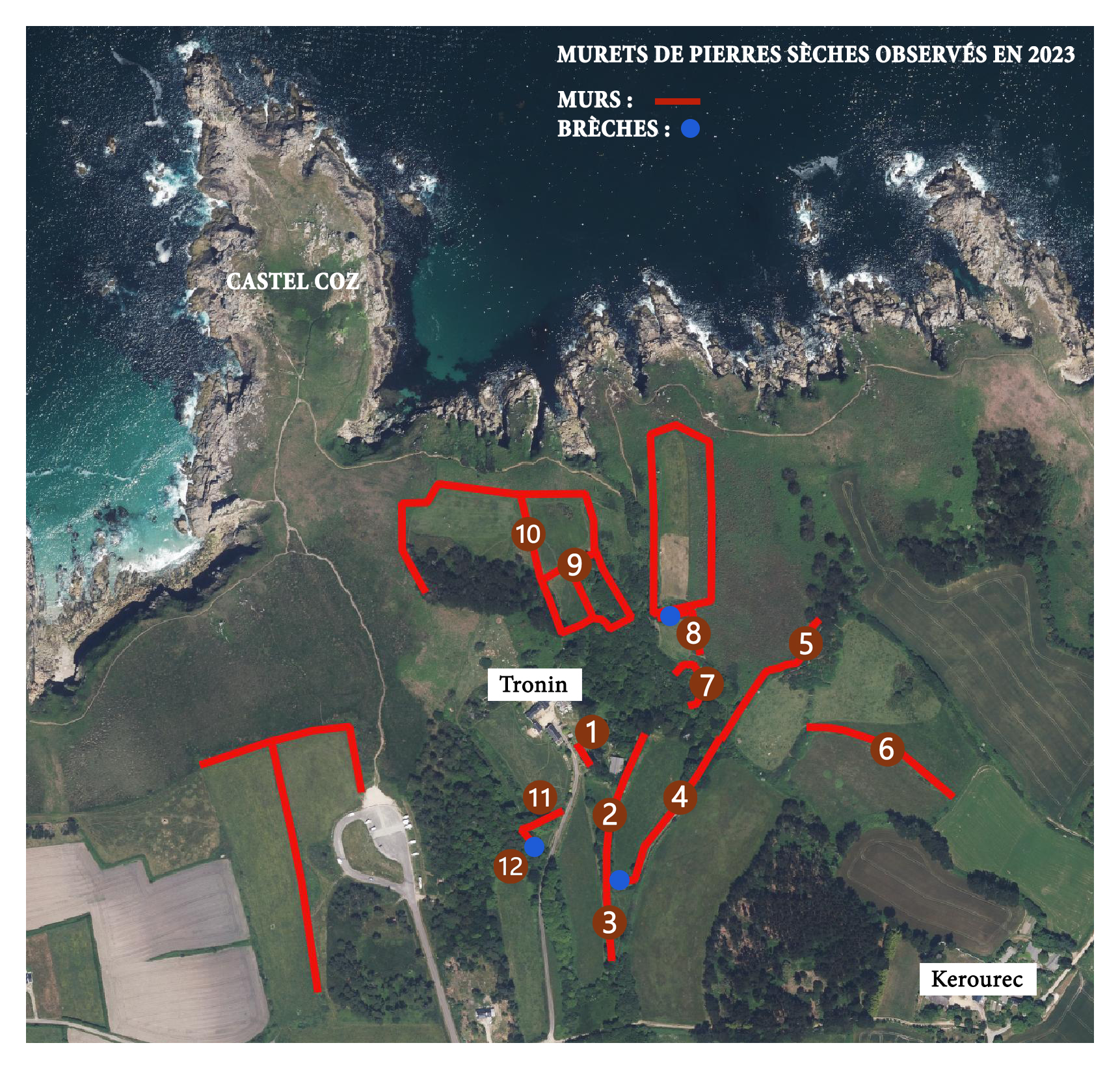 Localisation des murets de pierre sèche et brèches observés en 2023. Fond : orthophoto 2021.Immatriculation