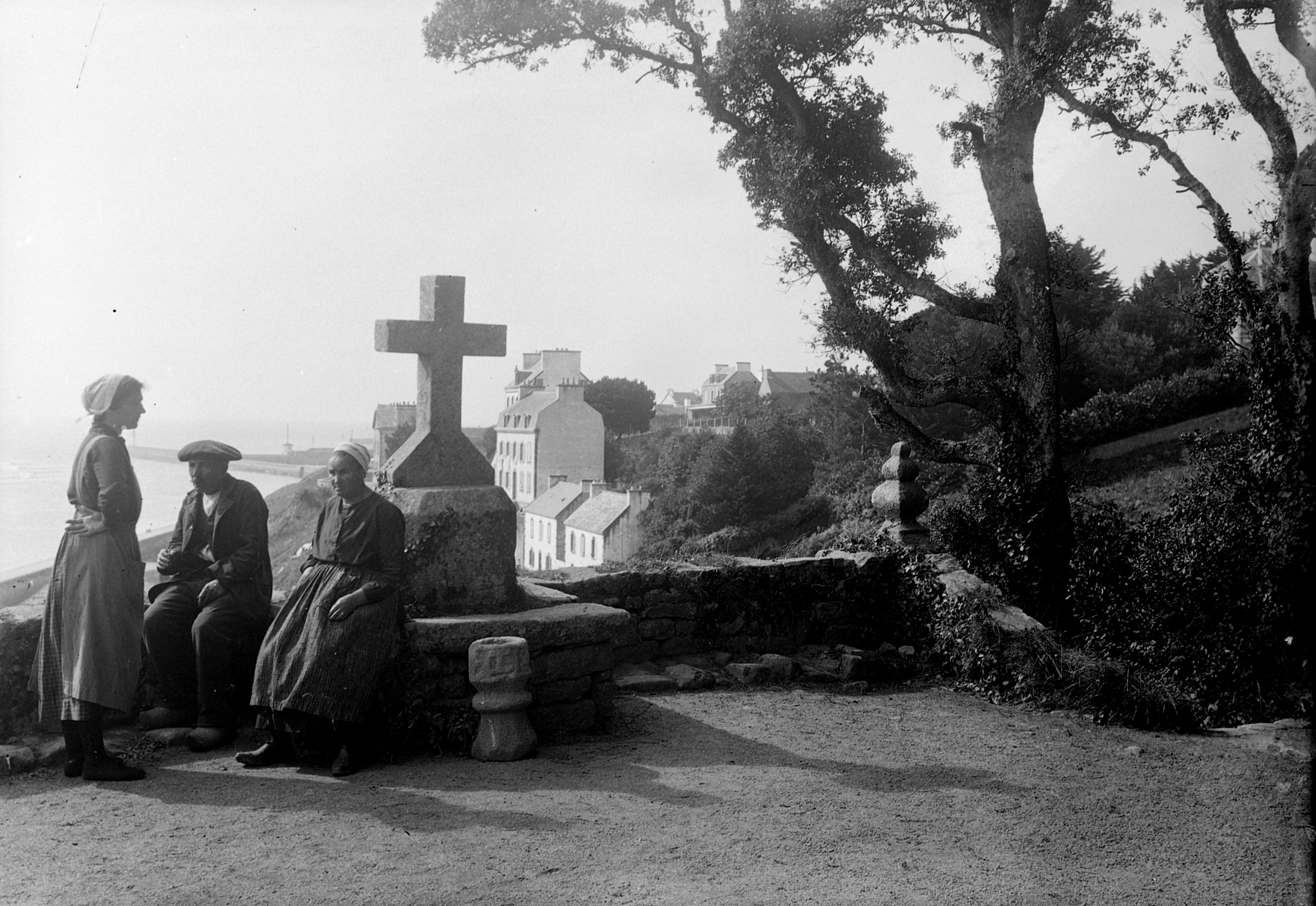 Terrasse et croix donnant sur la passerelle métallique. Reproduction négatif Villard, Quimper.Immatriculation
