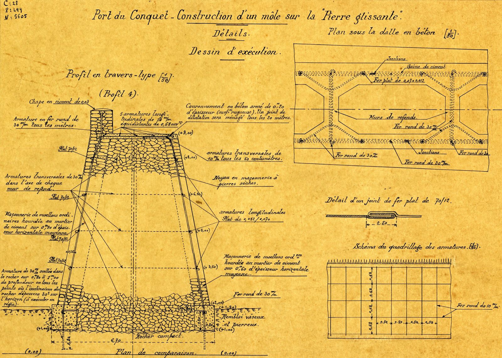 Port du Conquet, construction d'un môle sur la pierre-glissante, détails, dessin d'exécution et plan sous la dalle béton.